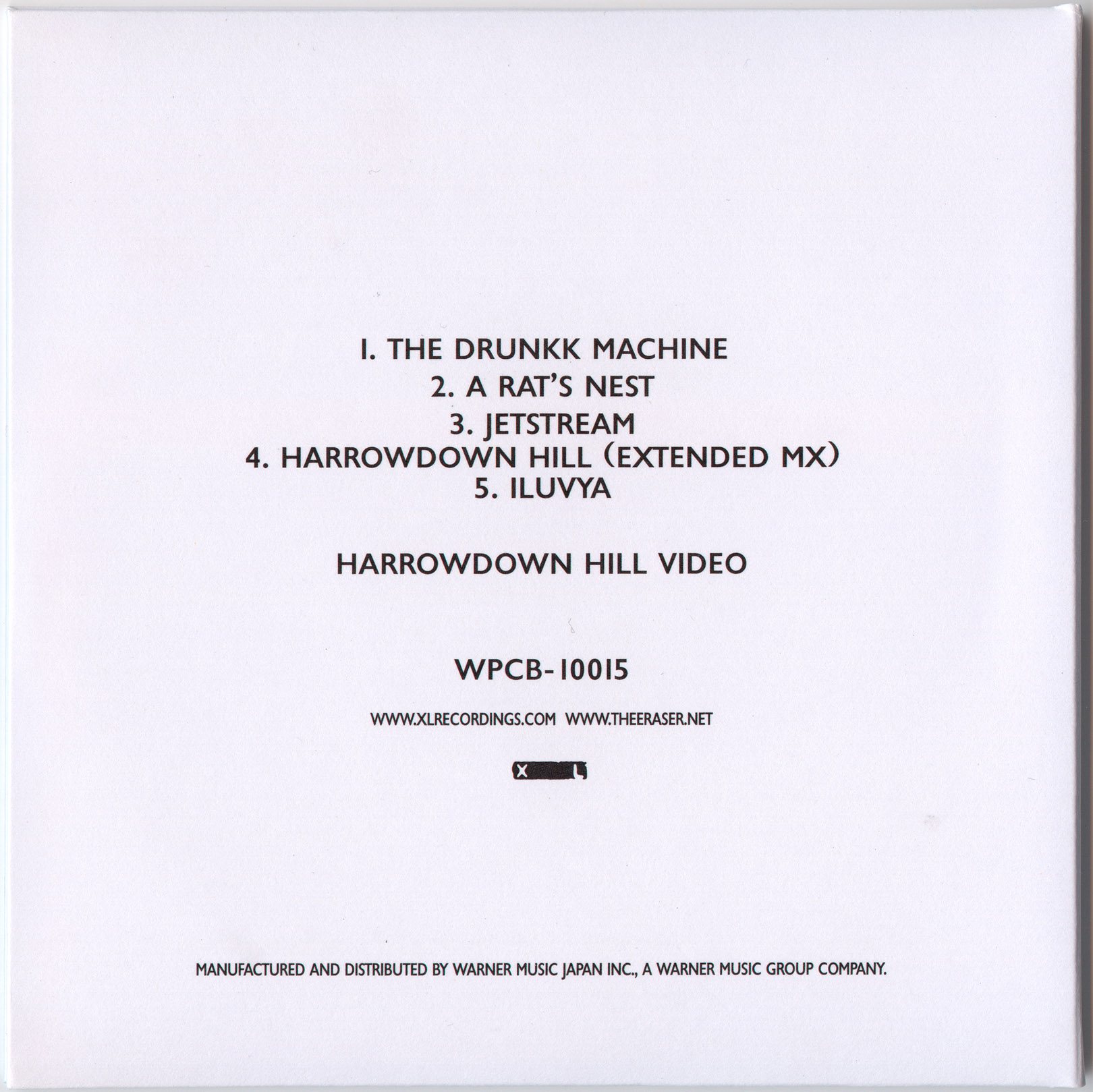 The EP contains 'The Drunkk Machine', 'A Rat's Nest', 'Jetstream', an "Extended Mix" of 'Harrowdown Hill' and 'Iluvya'. Also included on the disc was the video for 'Harrowdown Hill'.