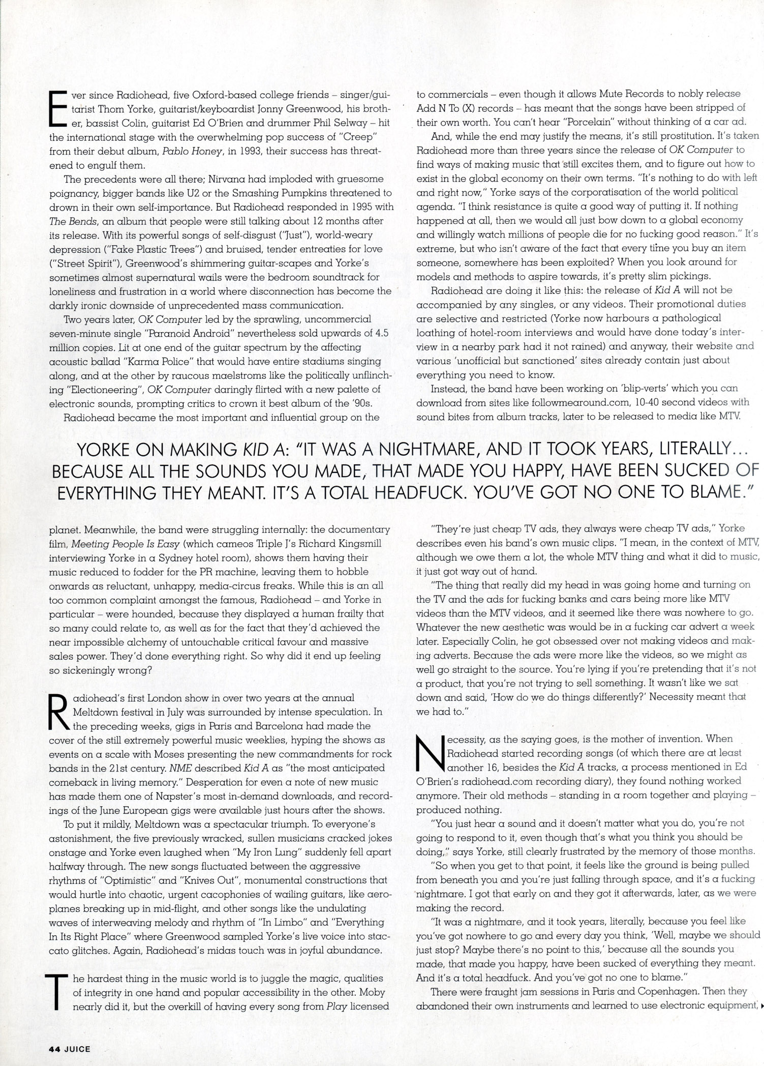 ..... "If you spend your life being a creative person and expend energy on regretting stuff you've done before, you are so fucked," Yorke offers, like a warning. "Because it will cramp you up and you'll never be able to work again. Because I think I skirted around the edges of that for a while. Quite a while." A pause. The singer is discussing the ramifications of the world's most important guitar band using principally electronic instruments on their new album. It's a dilemma that has made his life a misery of late.