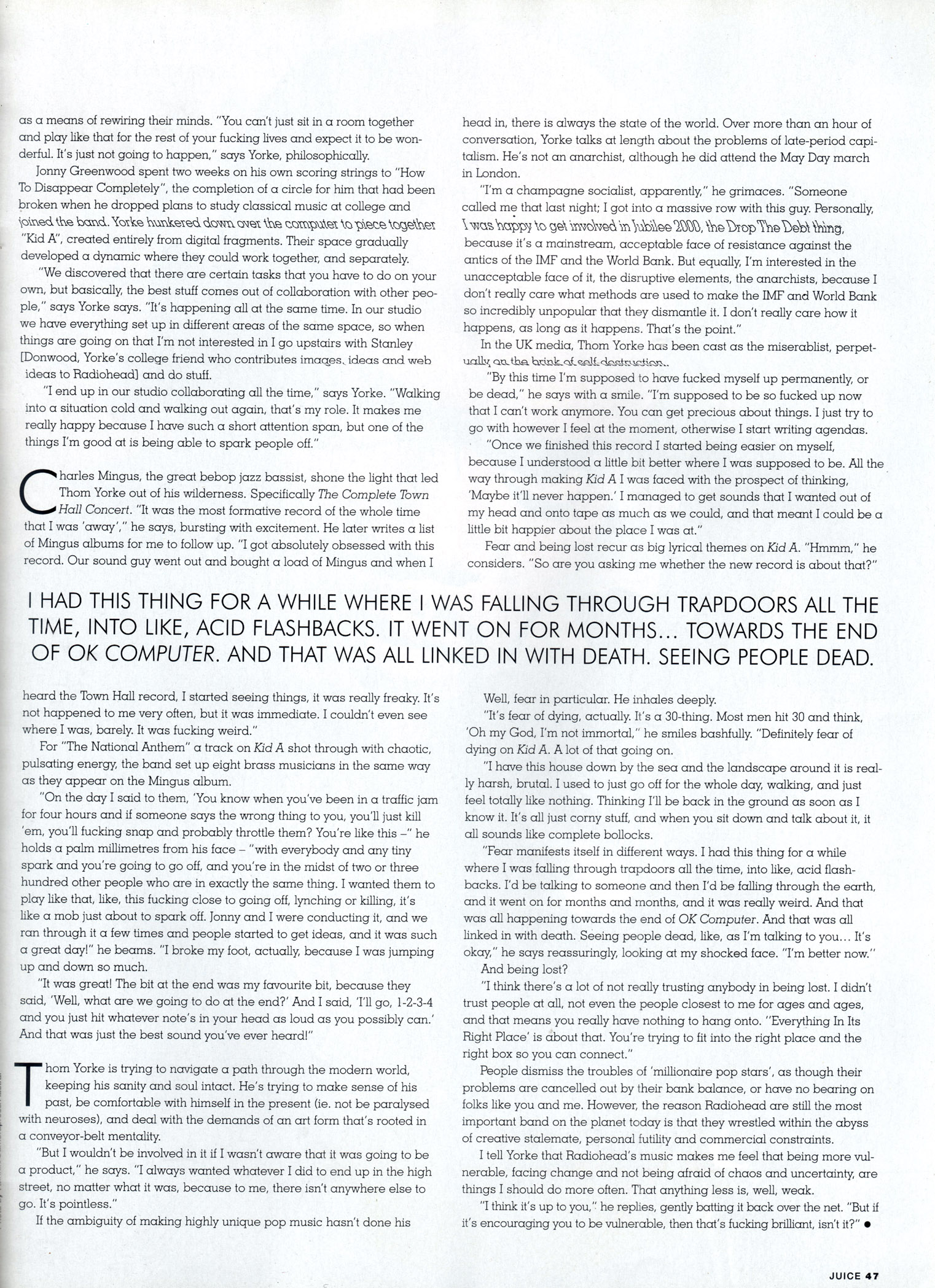 ..... "It's a fear of dying, actually. It's a 30-thing. Most men hit 30 and think, 'Oh my God, I'm not immortal," he smiles bashfully. "Definitely fear of dying on Kid A. A lot of that going on.
