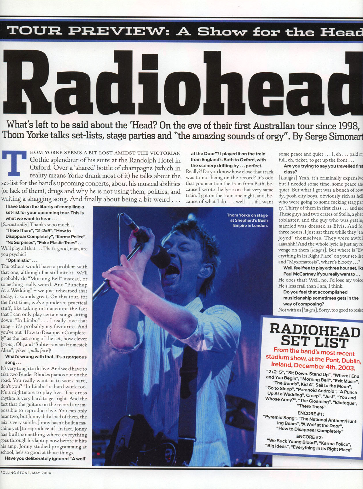 Thom Yorke seems a bit lost amidst the Victorian gothic splendour of his suite at the Randolph Hotel in Oxford. Over a ‘shared’ bottle of champagne (which in reality means Yorke drank most of it) he talks about the set-list for the band’s upcoming concerts, about his musical abilities (or lack of them), drugs and why he is not using them, politics, and writing a shagging song. And finally about being a bit weird..