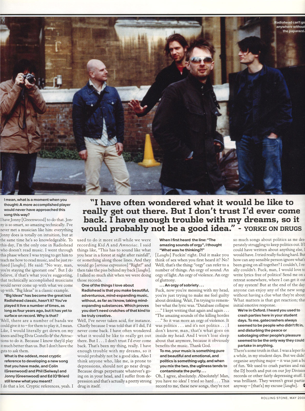 One of the things I love about Radiohead is that you make beautiful, adventurous, mind-expanding music, without, as far as I know, taking mind expanding substances. Which proves you don’t need crutches of that kind to be truly creative.