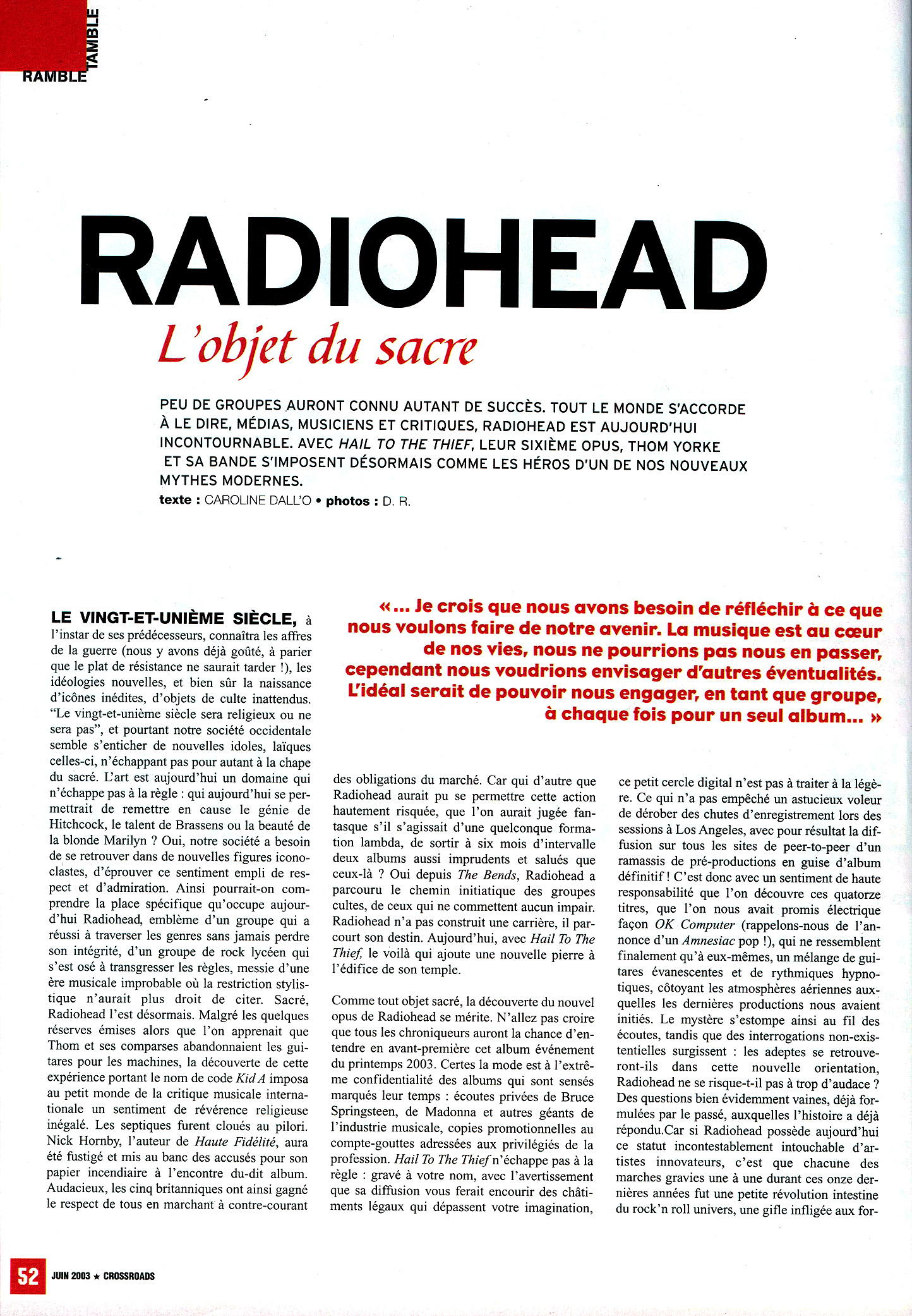 PEU DE GROUPES AURONT CONNU AUTANT DE SUCCÈS. TOUT LE MONDE S'ACCORDE À LE DIRE, MÉDIAS, MUSICIENS ET CRITIQUES, RADIOHEAD EST AUJOURD'HUI INCONTOURNABLE. AVEC HAIL TO THE THIEF, LEUR SIXIÈME OPUS, THOM YORKE ET SA BANDE S'IMPOSENT DÉSORMAIS COMME LES HÉROS D'UN DE NOS NOUVEAUX MYTHES MODERNES.