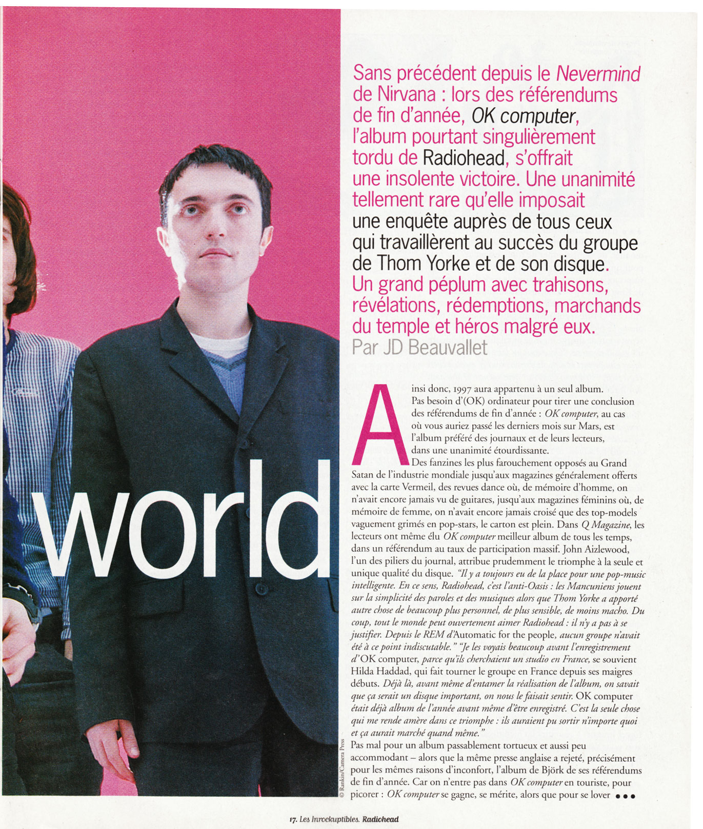 En Angleterre, seul le NME a refusé à OK computer le titre d'album de l'année, lui préférant le Ladies & gentlemen, we are floating in space de Spiritualized dont le leader Jason Pierce avouait d'ailleurs, quelques jours après avoir reçu sa médaille en chocolat, que ce choix "en disait plus long sur le New Musical Express que sur l'album de Spiritualized". On rappelle que Radiohead ne s'est jamais prosterné devant la puissance du NME. Et que l'hebdomadaire a toujours été particulièrement coquet quant à son image de marque et son positionnement. Johnny Dee, l'une des vedettes du journal, se souvient du mois de décembre dernier, quand le NME passait aux urnes pour élire l'album de l'année. "OK computer était le seul disque de l'année où chaque titre avait une raison d'être. Il est arrivé à un moment où, soudain, on avait à nouveau le droit d'écouter de la musique sérieuse. Et quand il a fallu choisir l'album de l'année, on était sûr que Radiohead serait premier partout ailleurs. Du coup, pour affirmer que le journal reste la voix des marginaux, Radiohead s'est retrouvé second. Alors que tout le monde avait voté pour OK computer." On a eu beau chercher, forcer Internet à se gratter les méninges, on n'a trouvé qu'une toute petite voix pour s'élever contre OK computer : celle de Mike Usinger du Georgia Straight, sorte de Berry Républicain d'Atlanta "Cette musique rêveuse possède aussi son cauchemar : Thom Yorke. Sa façon de geindre, dans les aigus, ruine totalement ces chansons. Il donne ainsi aux Américains une occasion de plus de haïr les rock-stars anglaises."