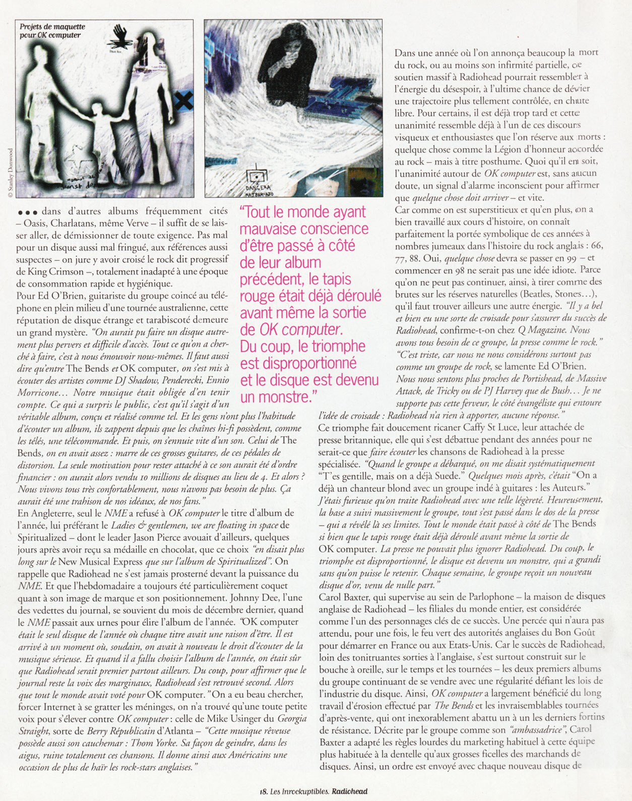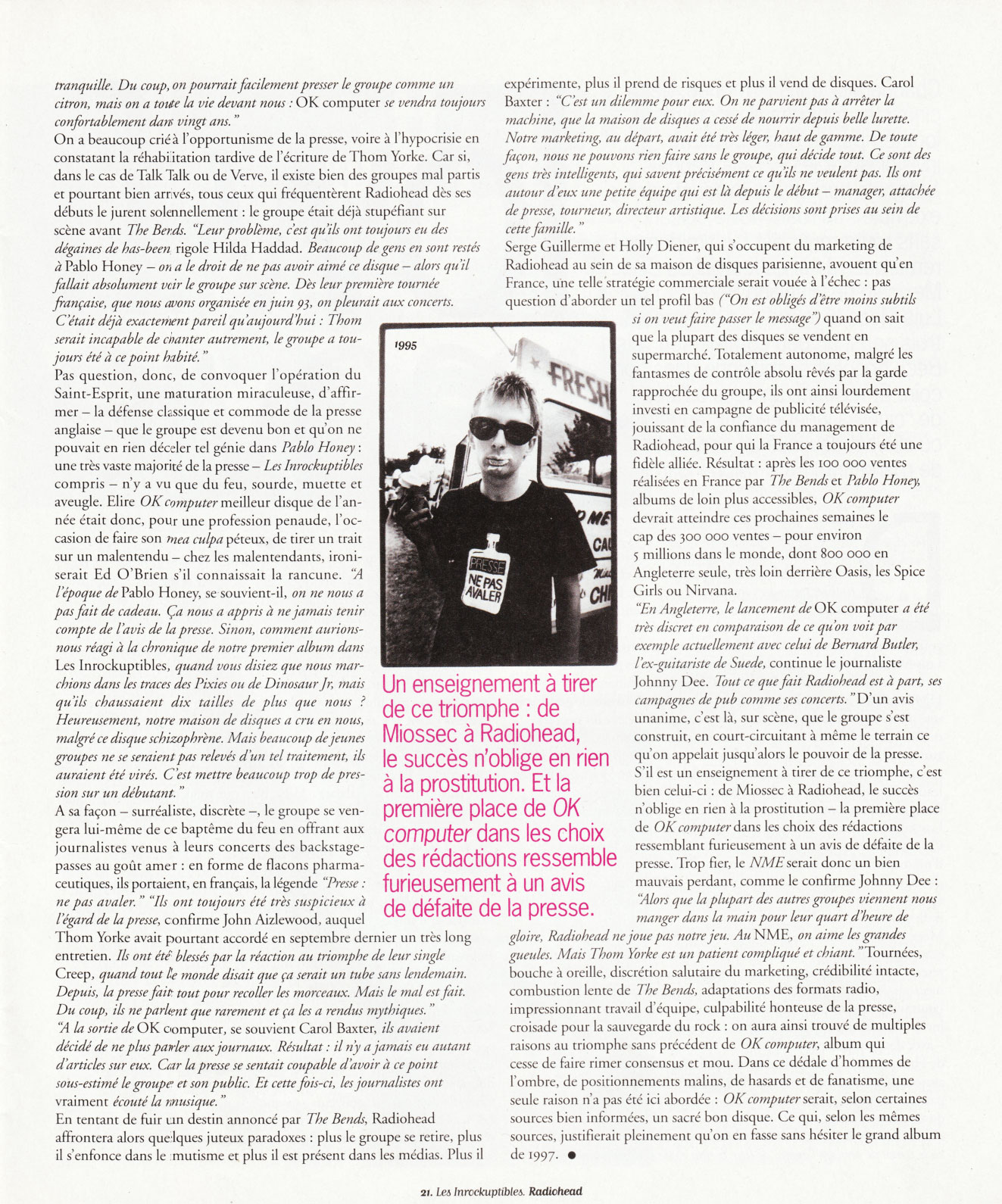 Ce triomphe fait doucement ricaner Caffy St Luce, leur attachée de presse britannique, elle qui s'est débattue pendant des années pour ne serait-ce que faire écouter les chansons de Radiohead à la presse spécialisée. "Quand le groupe a débarqué, on me disait systématiquement "T'es gentille, mais on a déjà Suede." Quelques mois après, c'était "On a déjà un chanteur blond avec un groupe indé à guitares : les Auteurs." J'étais furieuse qu'on traite Radiohead avec une telle légèreté. Heureusement, la base a suivi massivement le groupe, tout s'est passé dans le dos de la presse qui a révélé là ses limites. Tout le monde était passé à côté de The Bends si bien que le tapis rouge était déjà déroulé avant même la sortie de OK computer. La presse ne pouvait plus ignorer Radiohead. Du coup, le triomphe est disproportionné, le disque est devenu un monstre, qui a grandi sans qu'on puisse le retenir. Chaque semaine, le groupe reçoit un nouveau disque d'or, venu de nulle part."