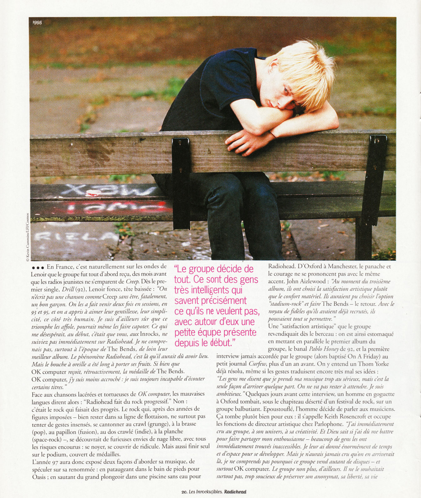 Une "satisfaction artistique" que le groupe revendiquait dès le berceau : on est ainsi estomaqué en mettant en parallèle le premier album du groupe, le banal Pablo Honey de 92, et la première interview jamais accordée par le groupe (alors baptisé On A Friday) au petit journal Curfew, plus d'un an avant. On y entend un Thom Yorke déjà résolu, même si les gestes traduisent encore très mal ses idées : "Les gens me disent que je prends ma musique trop au sérieux, mais c'est la seule façon d'arriver quelque part. On ne va pas rester à attendre. Je suis ambitieux." Quelques jours avant cette interview, un homme en goguette à Oxford tombait, sous le chapiteau déserté d'un festival de rock, sur un groupe balbutiant. Epoustouflé, l'homme décide de parler aux musiciens. Ça tombe plutôt bien pour eux : il s'appelle Keith Rosencroft et occupe les fonctions de directeur artistique chez Parlophone. "J'ai immédiatement cru au groupe, à son univers, à sa créativité. Et Dieu sait si j'ai dû me battre pour faire partager mon enthousiasme beaucoup de gens les ont immédiatement trouvés inaccessibles. Je leur ai donné énormément de temps et d'espace pour se développer. Mais je n'aurais jamais cru qu'on en arriverait là, je ne comprends pas pourquoi ce groupe vend autant de disques et surtout OK computer. Le groupe non plus, d'ailleurs. Il ne le souhaitait surtout pas, trop soucieux de préserver son anonymat, sa liberté, sa vie tranquille. Du coup, on pourrait facilement presser le groupe comme un citron, mais on a toute la vie devant nous : OK computer se vendra toujours confortablement dans vingt ans."