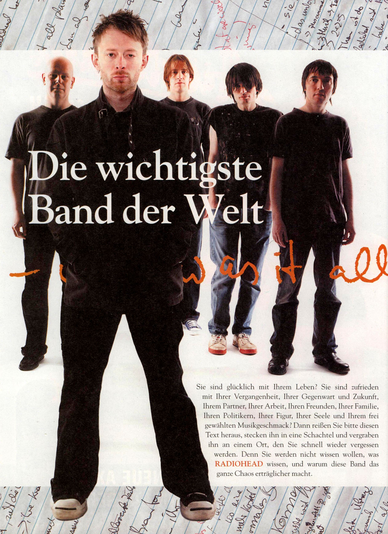 Sie sind glücklich mit Ihrem Leben? Sie sind zufrieden mit Ihrer Vergangenheit, Ihrer Gegenwart und Zukunft, Ihrem Partner, Ihrer Arbeit, Ihren Freunden, Ihrer Familie, Ihren Politikern, Ihrer Figur, Ihrer Seele und Ihrem frei gewählten Musikgeschmack? Dann reißen Sie bitte diesen Text heraus, stecken ihn in eine Schachtel und vergraben ihn an einem Ort, den Sie schnell wieder vergessen werden. Denn Sie werden nicht wissen wollen, was RADIOHEAD wissen, und warum diese Band das ganze Chaos erträglicher macht.