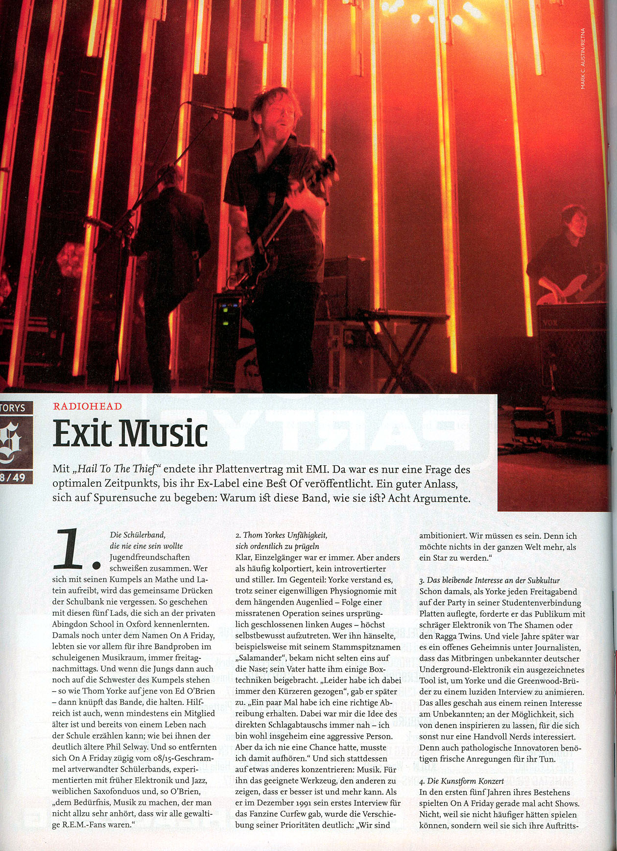 Diese Band ist pure Verweigerungshaltung. Das Zirkuszelt war so eine, wie auch die Idee, „Paranoid Android” zur Single zu machen, das mit 6:36 Minuten längste Stück von „OK Computer”. Sie verweigerten sich dem Hype, indem sie auf dem Zenith ihres Erfolgs mit „OK Computer” für Jahre im Off verschwanden und erst wiederkehrten, als sie mit „Kid A” und dem kurz darauf veröffentlichten „Amnesiac” das Rad der modernen Musik ein Stück weit neu erfanden und den Begriff Postrock mit etablierten. Sie verweigerten sich den Marktmechanismen, als sie schon früh entschieden, ihre größte Hitsingle „Creep” nicht mehr live zu spielen. Und erst recht, als sie mit „In Rainbows” neue Vertriebswege testeten und damit dem klassischen Plattenfirmen-Modell den Mittelfinger zeigten. Auch diese betonte Eigensinnigkeit findet ihren Ursprung in ganz frühen Tagen: Als Ed O’Brien die Hauptrolle in einer Schulaufführung von Shakespeares „Sommernachtstraum” übernahm, besorgte er Yorke den Job der musikalischen Untermalung. Der weigerte sich trotz lautstarker Fetzereien mit den Lehrern, etwas anderes zu spielen als Freejazz. Lieber nahm er den Rausschmiss aus dem Ensemble in Kauf, als sich verbiegen zu lassen.