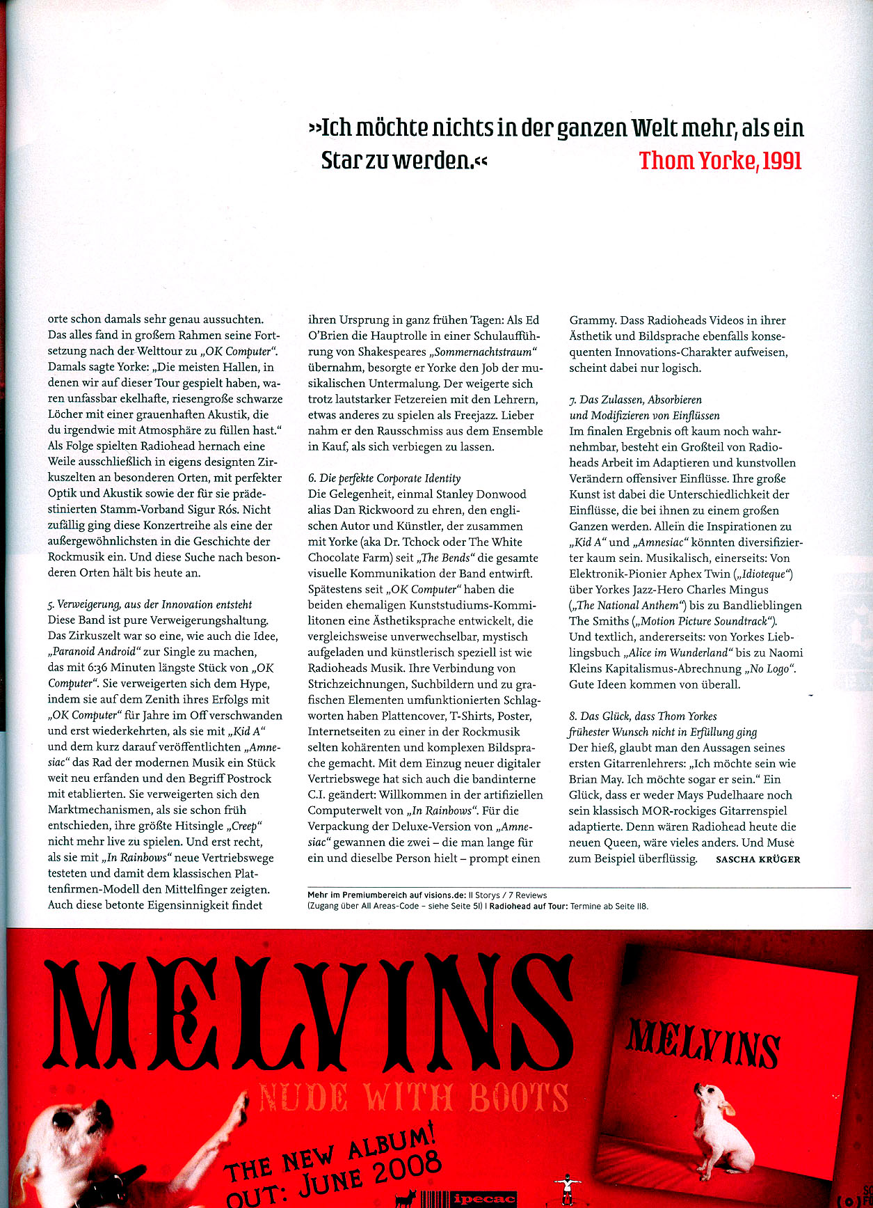 Die Gelegenheit, einmal Stanley Donwood alias Dan Rickwoord zu ehren, den englischen Autor und Künstler, der zusammen mit Yorke (aka Dr. Tchock oder The White Chocolate Farm) seit „The Bends” die gesamte visuelle Kommunikation der Band entwirft. Spätestens seit „OK Computer” haben die beiden ehemaligen Kunststudiums-Kommilitonen eine Ästhetiksprache entwickelt, die vergleichsweise unverwechselbar, mystisch aufgeladen und künstlerisch speziell ist wie Radioheads Musik. Ihre Verbindung von Strichzeichnungen, Suchbildern und zu grafischen Elementen umfunktionierten Schlagworten haben Plattencover, T-Shirts, Poster, Internetseiten zu einer in der Rockmusik selten kohärenten und komplexen Bildsprache gemacht. Mit dem Einzug neuer digitaler Vertriebswege hat sich auch die bandinterne C.I. geändert: Willkommen in der artifiziellen Computerwelt von „In Rainbows”. Für die Verpackung der Deluxe-Version von „Amnesiac” gewannen die zwei – die man lange für ein und dieselbe Person hielt – prompt einen Grammy. Dass Radioheads Videos in ihrer Ästhetik und Bildsprache ebenfalls konsequenten Innovations-Charakter aufweisen, scheint dabei nur logisch.
