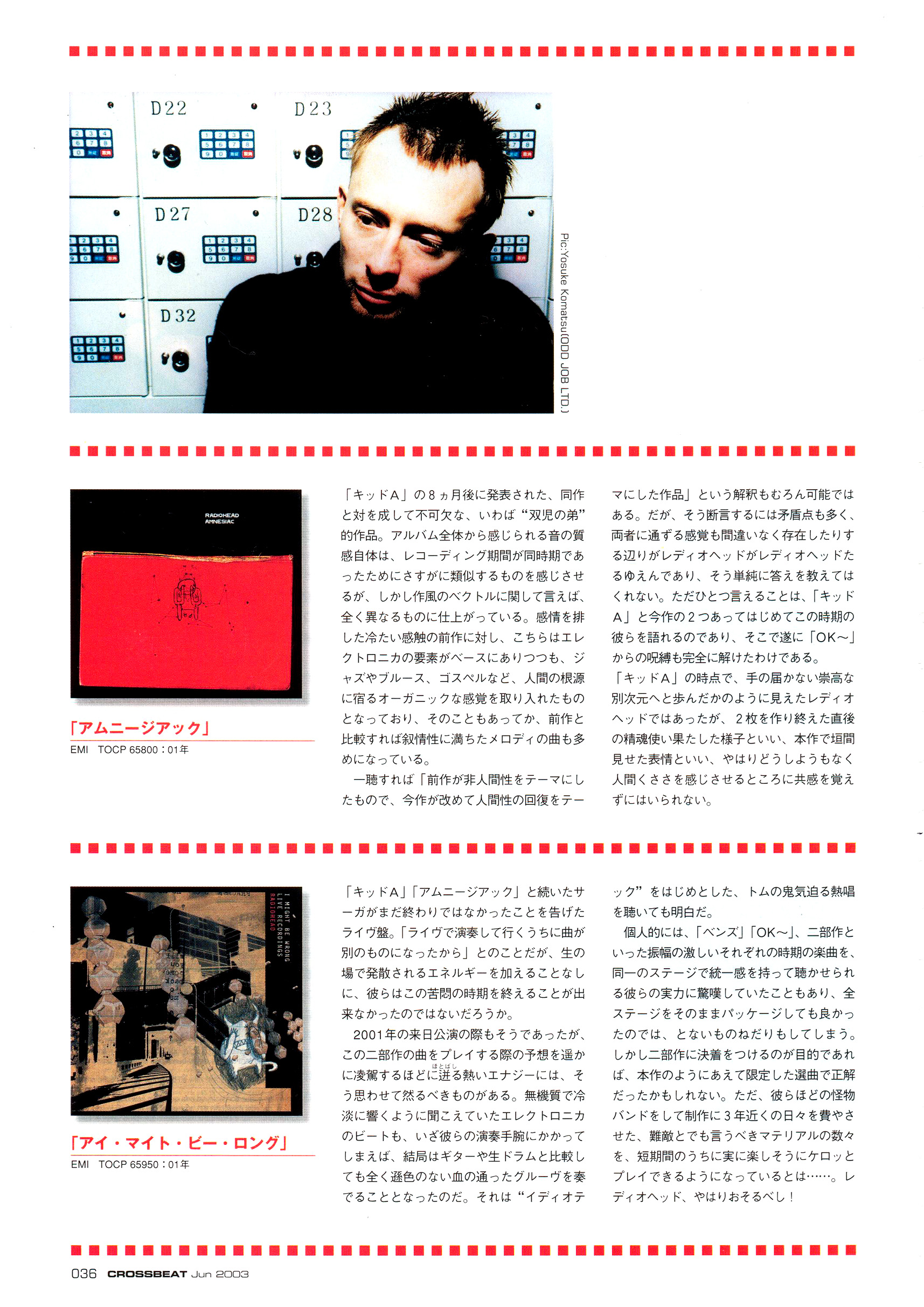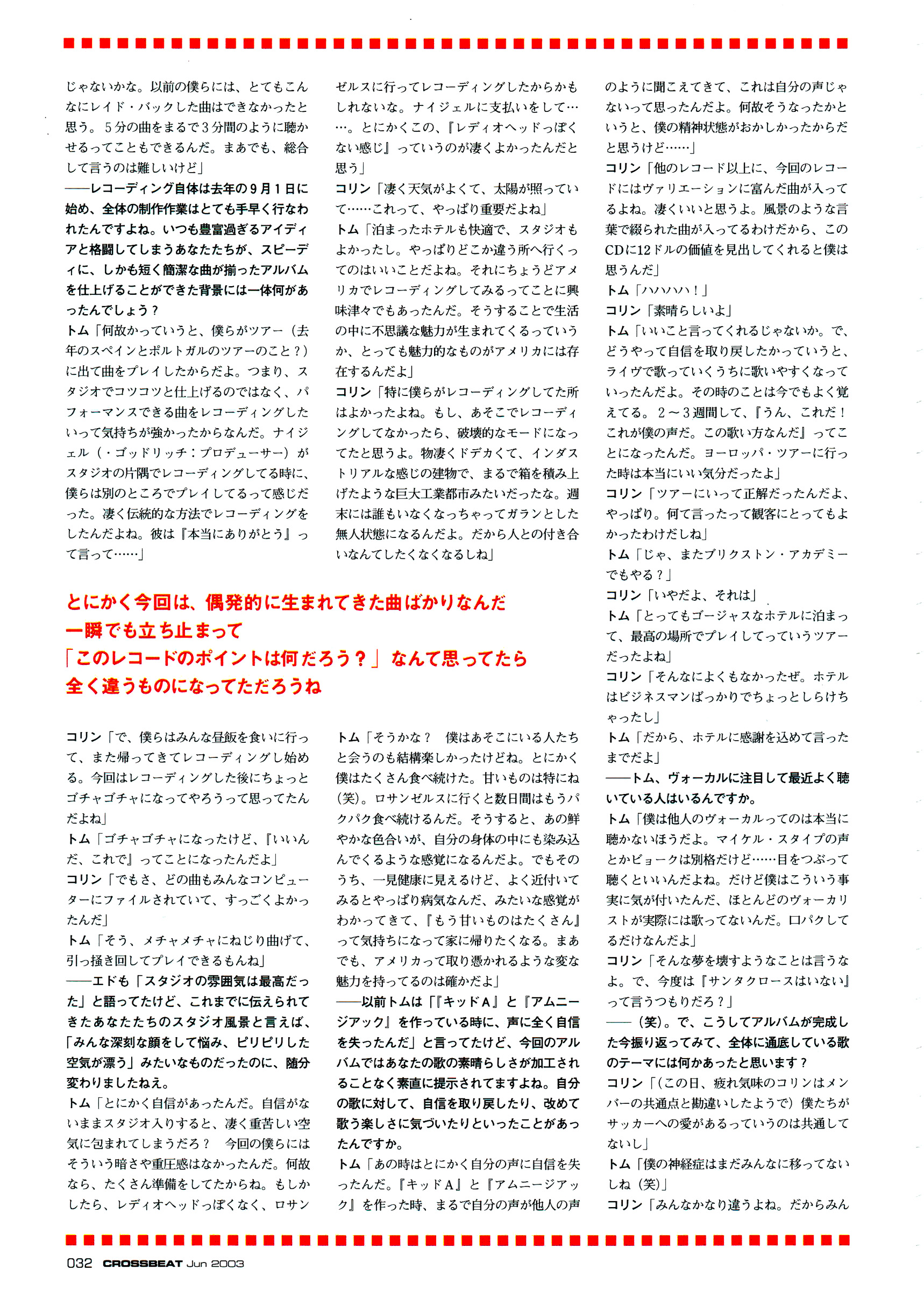 トム 「とにかく自信があったんだ。自信がな いままスタジオ入りすると、凄く重苦しい空 気に包まれてしまうだろ?今回の僕らには そういう暗さや重圧感はなかったんだ。何故 なら、たくさん準備をしてたからね。もしか したら、レデイオヘッドつ丨?くなく、ロサン ゼルスに行ってレコーディングしたからかも しれないな。ナイジェルに支払いをして… …。とにかくこの、『レディオヘッドっぽく ない感じ』っていうのが凄くよかったんだと 思ぅ」