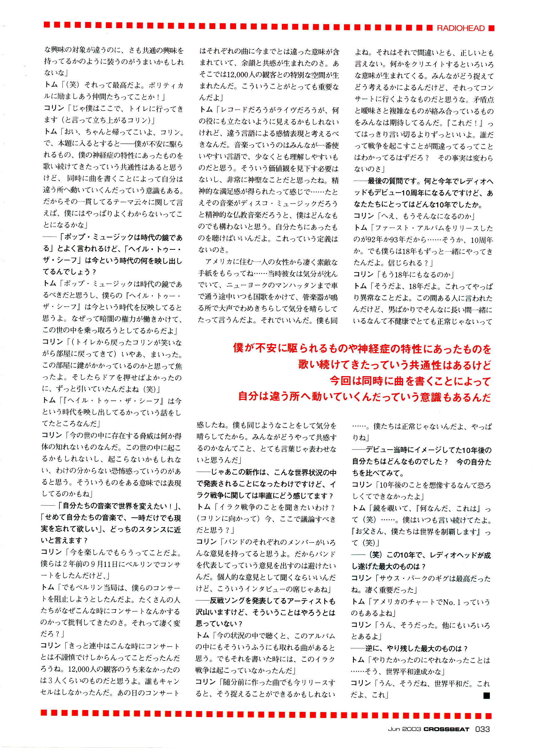 コリン 「随分前に作った曲でも今リリースす ると、そう捉えることができるかもしれない よね。それはそれで間違いとも、正しいとも 言えない。何かをクリエィトするといろいろ な意味が生まれてくる。みんながどう捉えて どう考えるかによるんだけど、それってコン サ一トに行くようなものだと思うな。矛盾点 と暧味さと複雑なもの力猫み合っているもの をみんなは期待してるんだ。『これだ!』つ てはっきり言い切るよりずっといいよ。誰だ って戦争を起こすことが間違ってるってこと はわかってるはずだろ?その事実は変わら ないのさ」