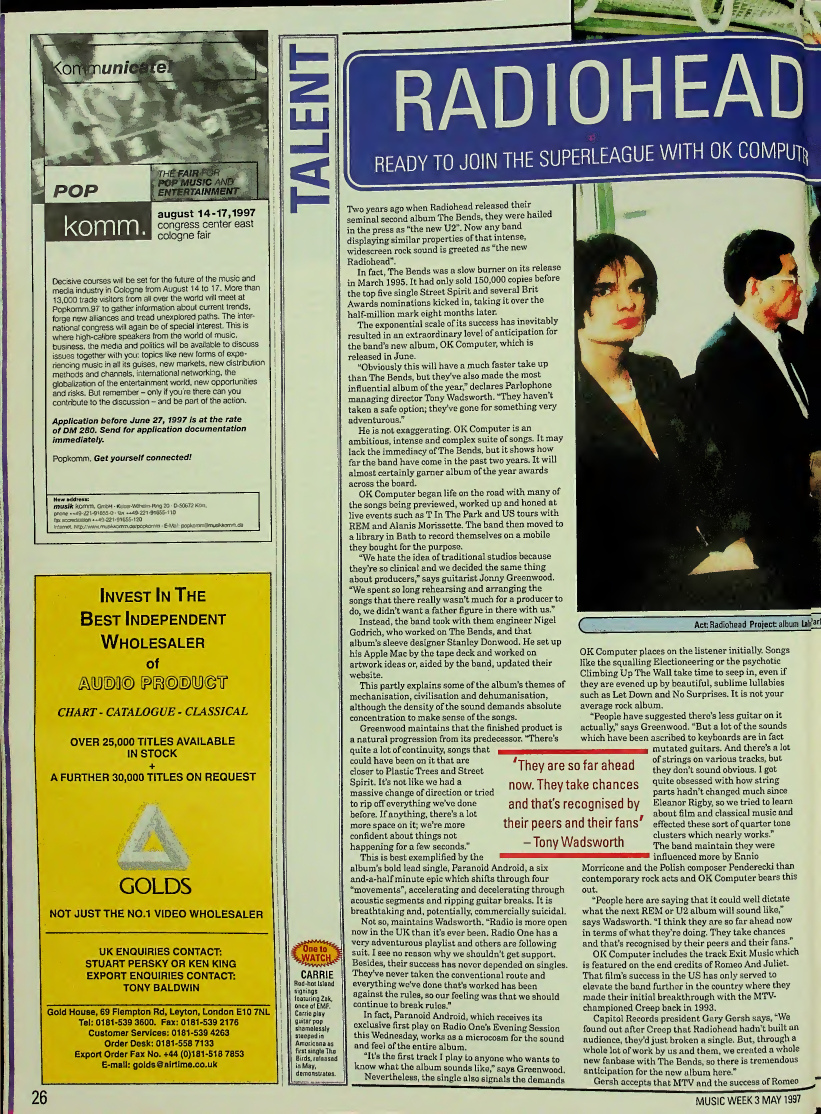 "Obviously this will have a much faster take up than The Bends, but they've also made the most influential album of the year," declares Parlophone managing director Tony Wadsworth. "They haven't taken a safe option; they've gone for something very adventurous."