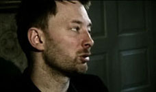 Thom: "I don't... maybe. The thing is that, you know, the general... the Kid A and Amnesiac thing was... because what was happening is we were going down a lot of sort of programming route. It's a very boring business, you know, being in the studio, if you're a band, looking at a computer screen. It doesn't really make sense. I mean it makes sense to a certain extent, but, you know, you're sucking the energy out of the proceedings, and that's something we were very conscious of when we were doing Hail to the Thief, of not going there. Erm... uhh... and yeah, part of me thinks it's a good idea to separate them, so you have to load this program stuff and it's a separate entity and blah blah blah, and then the band works as a band and it's like five people playing in real time. But I think the most exciting stuff that we've ever done has been when the two cross over. When we're forced to learn something that's been sequenced or we're using the computers to adapt something that we play live, and things like that. I think there'd be no point in Radiohead carrying on as if... if all we did was work in that sort of live performance sort of way. I mean - saying that - obviously with doing The Eraser on my own, it was very, very deliberately sort of just me and Nigel deliberately using computers a lot just for their speed and for a different sort of aesthetic, you know. You can spend too long dwelling on stuff that there's no point dwelling on, and I did that, personally. And it's really just... the whole thing for me is just hanging out with people and with Radiohead again, and having done my record... it's sort of... I feel there's a point to carry on working, so that's all I need, really. I mean for a long time I didn't feel there was a point, so I guess that's good. Yeah, better."