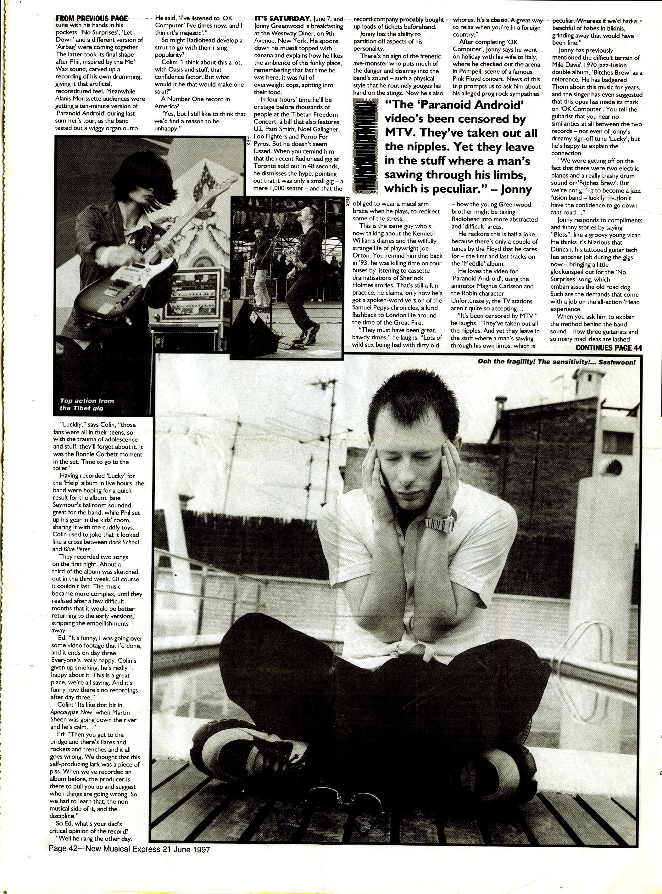 It’s margarita time in Oxford, May 29, as Ed, Colin and Phil warm their bones in a beer garden and the chaps – and how better to describe these three with their ever-pulsating brains, with their top humour and proper manners – have been checking the monthly music mags. It seems that everybody rates ‘OK Computer’ as a mighty record. Old NME troopers like Nick Kent and Paul Morley have been commissioned to write critiques – the vibe being that here is a special occasion to celebrate. Even Rolling Stone magazine has marked it out for a lead review, complete with a suitably mad illustration.