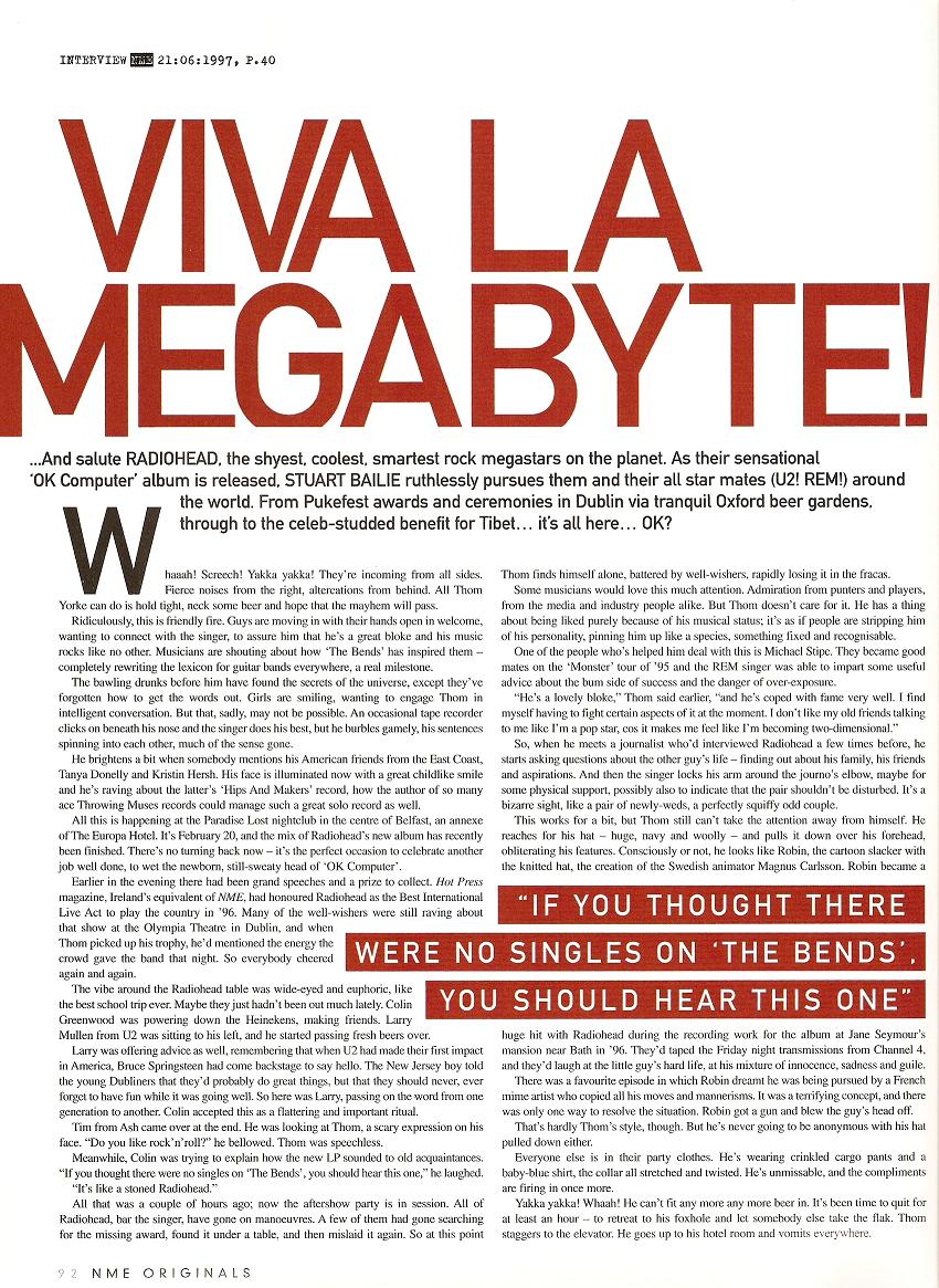 …And salute RADIOHEAD, the shyest, coolest, smartest rock megastars on the planet. As their sensational ‘OK Computer’ album is released, STUART BAILIE ruthlessly pursues them and their all star mates (U2! REM!) around the world. From Pukefest awards and ceremonies in Dublin via tranquil Oxford beer gardens, through to the celeb-studded benefit for Tibet… it’s all here… OK?