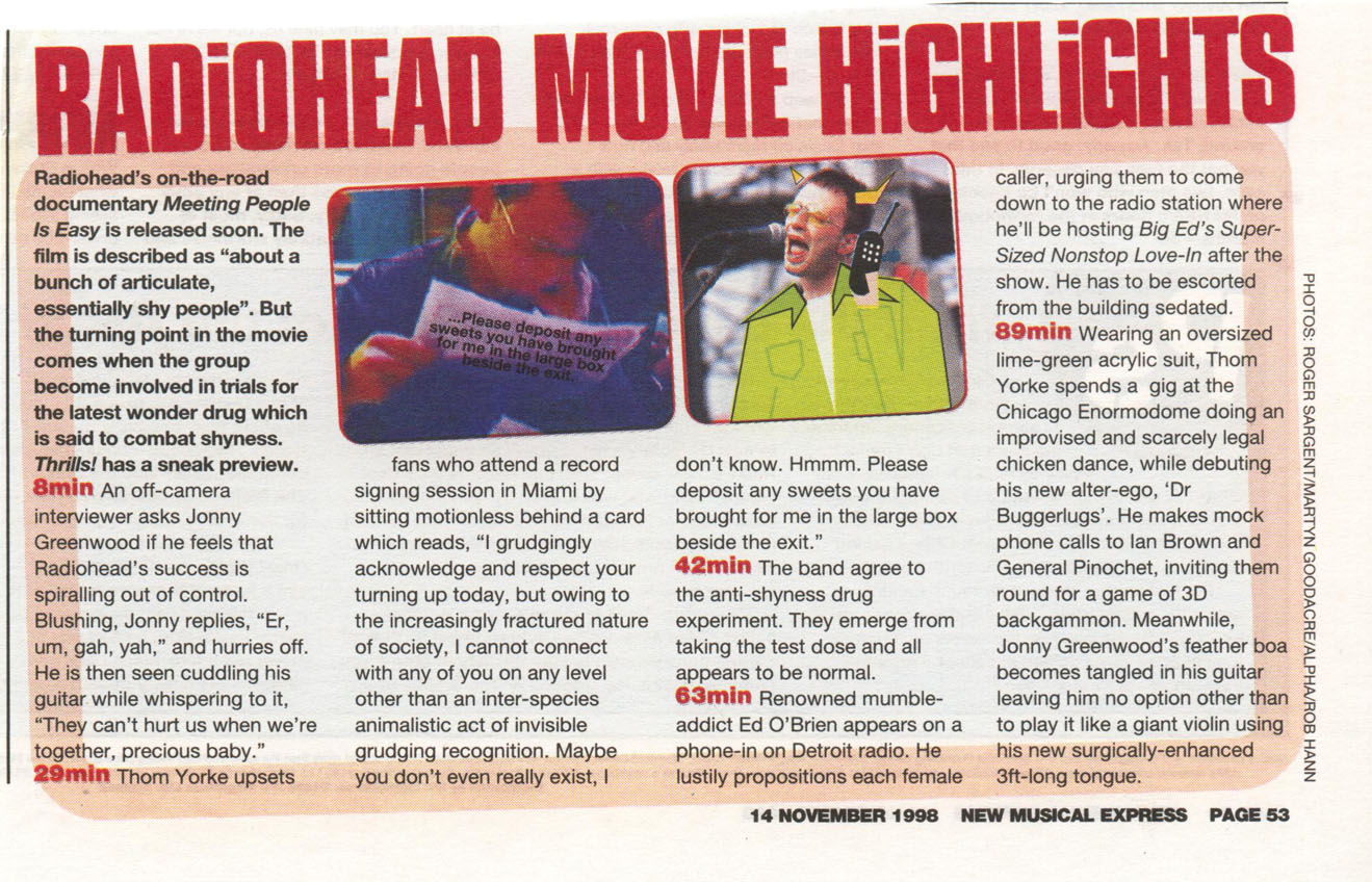 Radiohead's on-the-road documentary Meeting People Is Easy is released soon. The film is described as “about a bunch of articulate, essentially shy people”. But the turning point in the movie comes when the group become involved in trials for the latest wonder drug which is said to combat shyness. Thrills! has a sneak preview.
