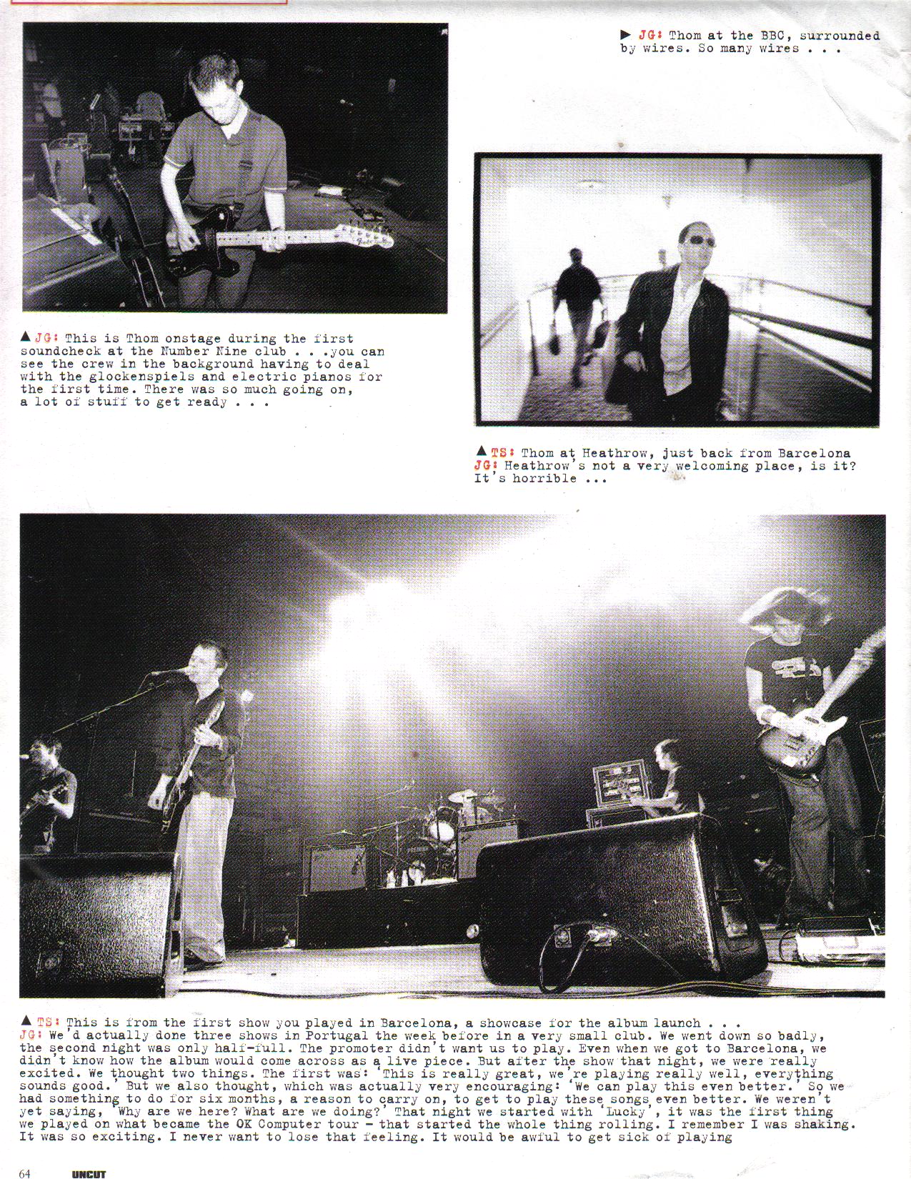 JG: We’d actually done three shows in Portugal the week before in a very small club. We went down so badly, the second night was only half-full. The promoter didn’t want us to play. Even when we go to Barcelona, we didn’t know how the album would come across as a live piece. But after the show that night, we were really excited. We thought two things. The first was: ‘This is really great, we’re playing really well, everything sounds good.’ But we also thought, which was actually very encouraging: ‘We can play this even better’. So we had something to do for six months, a reason to carry on, to get to play these songs even better. We weren’t yet saying ‘Why are we here? What are we doing?’ That night we started with ‘Lucky’, it was the first thing we played on what became the OK Computer tour – that started the whole thing rolling. I remember I was shaking. It was so exciting. I never want to lose that feeling. It would be awful to get sick of playing.