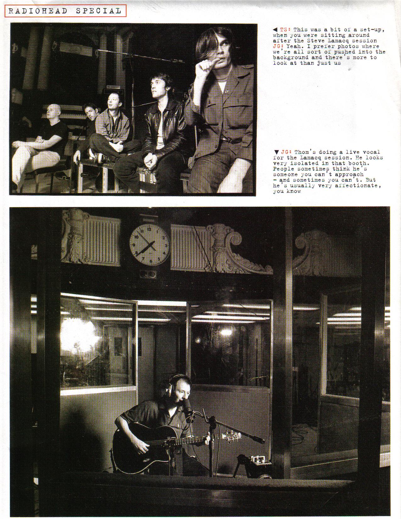 JG: Thom’s doing a live vocal for the Lamacq session. He looks very isolated in that booth. People sometimes think he’s someone you can’t approach – and sometimes you can’t. But he’s usually very affectionate, you know.
