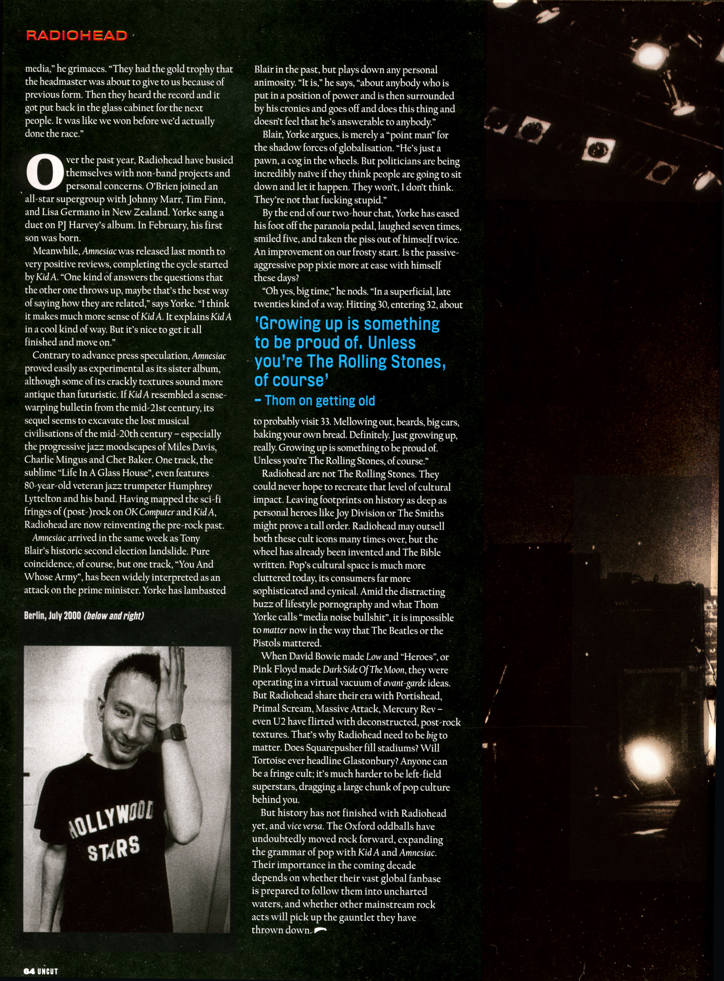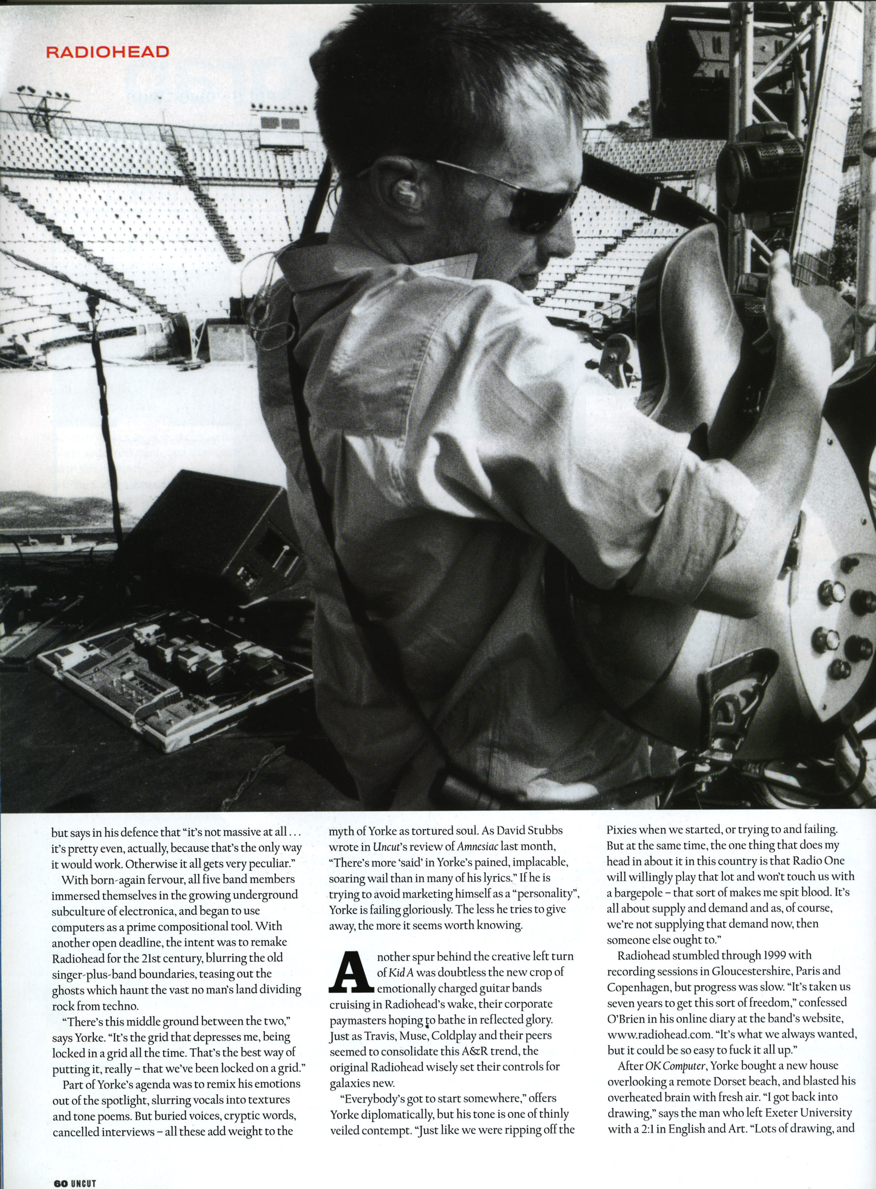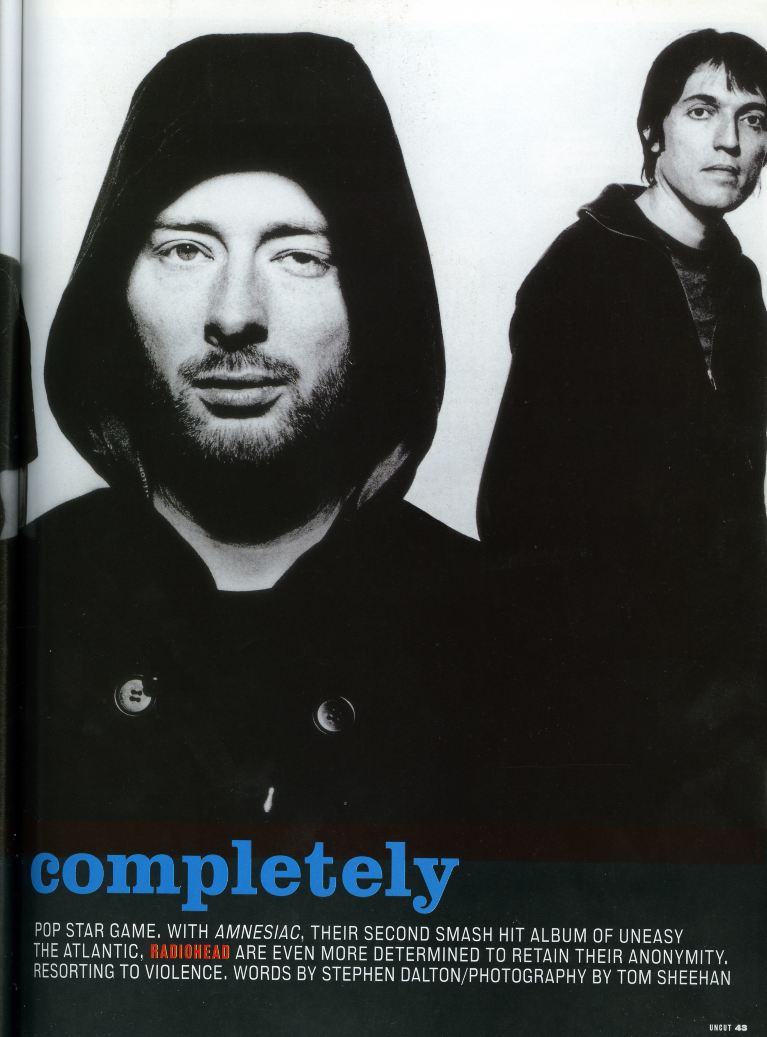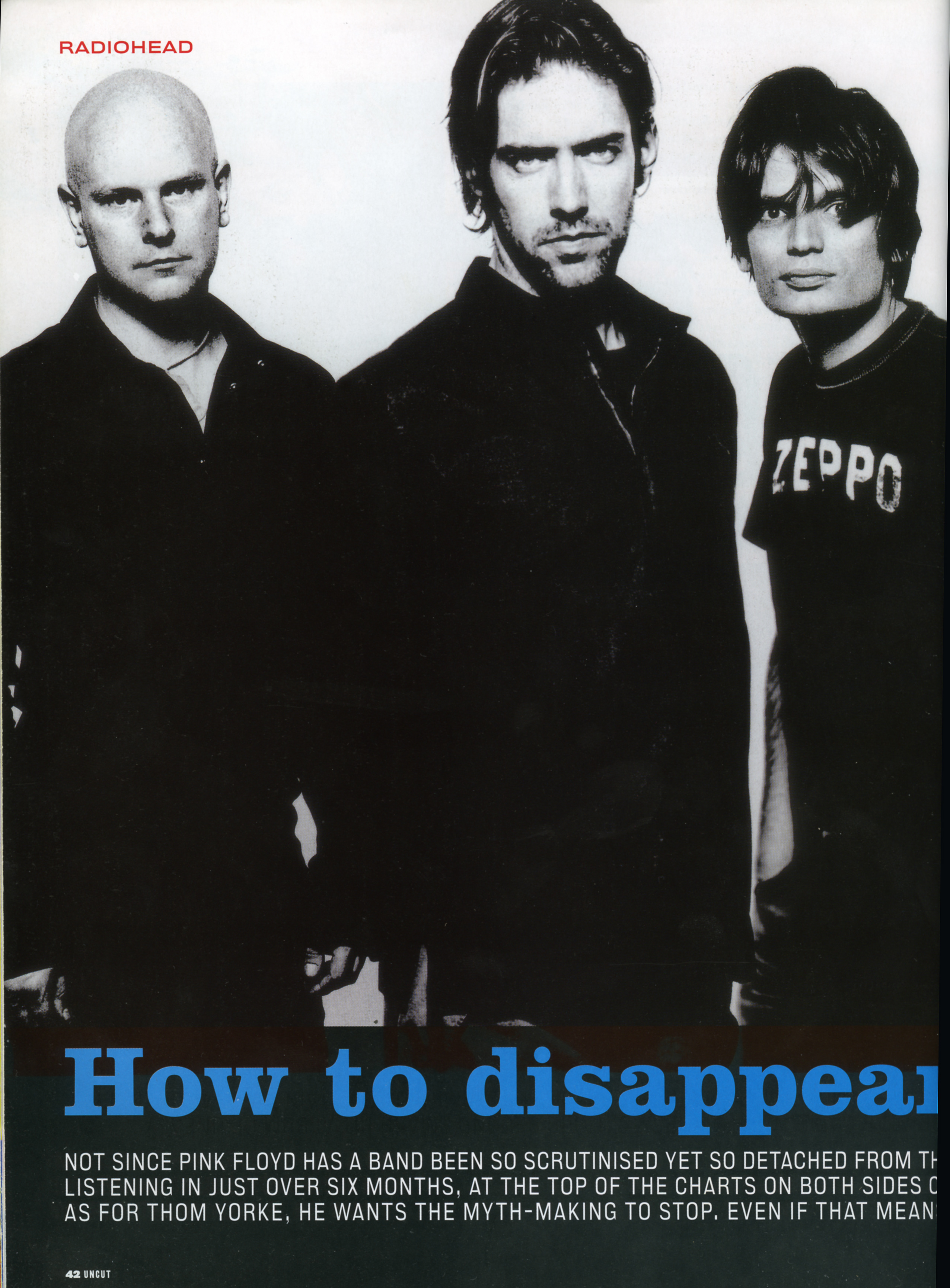 NOT SINCE PINK FLOYD HAS A BAND BEEN SO SCRUTINISED YET SO DETACHED FROM THE POP STAR GAME. WITH AMNESIAC, THEIR SECOND SMASH HIT ALBUM OF UNEASY LISTENING IN JUST OVER SIX MONTHS, AT THE TOP OF THE CHARTS ON BOTH SIDES OF THE ATLANTIC, RADIOHEAD ARE EVEN MORE DETERMINED TO RETAIN THEIR ANONYMITY. AS FOR THOM YORKE, HE WANTS THE MYTH-MAKING TO STOP, EVEN IF THAT MEANS RESORTING TO VIOLENCE.