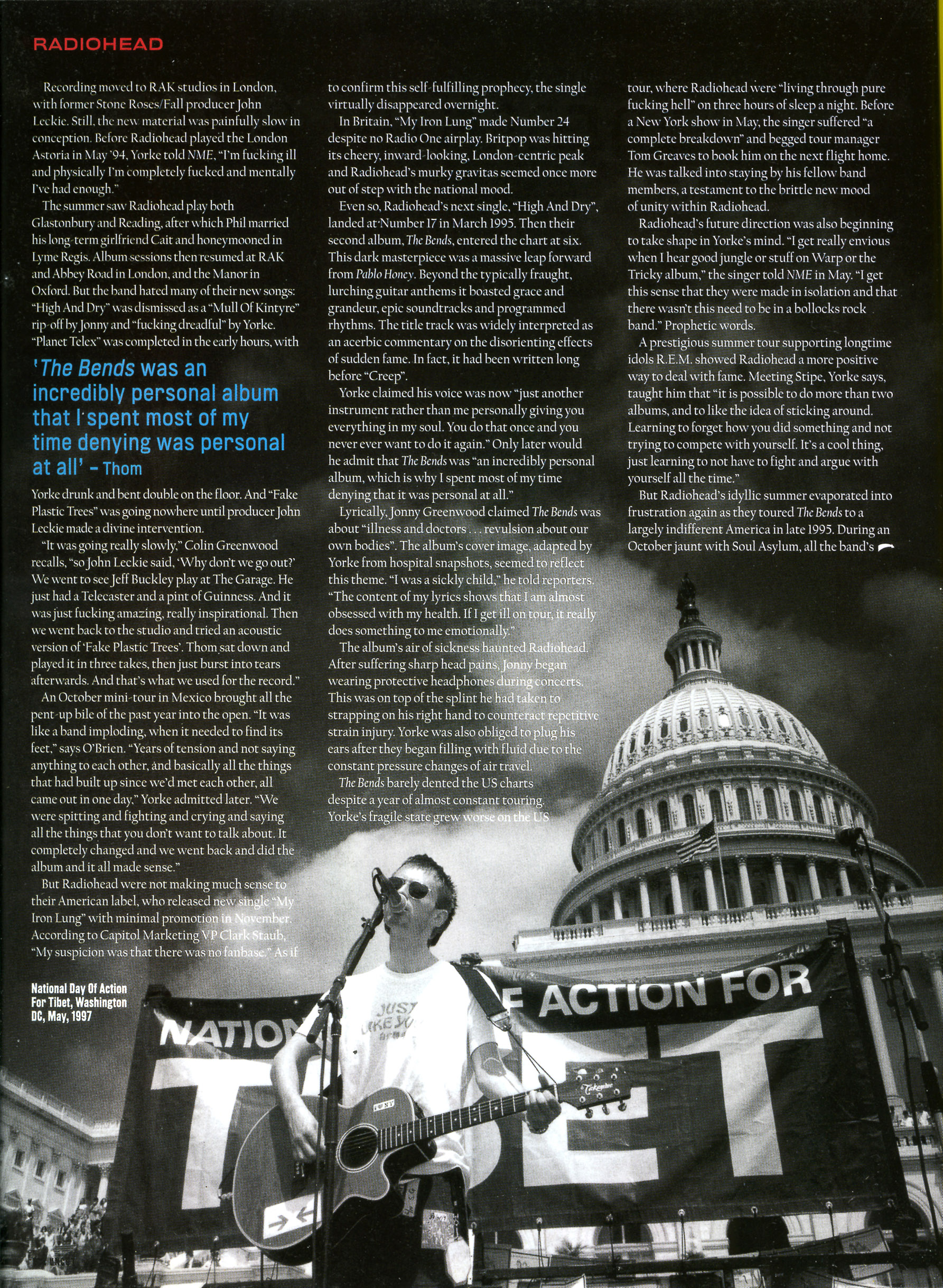 The Bends barely dented the US charts despite a year of almost constant touring. Yorke's fragile state grew worse on the US tour. Where Radiohead were "living through pure fucking hell" on three hours of sleep a night. Before a New York show in May, the singer suffered “a complete breakdown" and begged tour manager Tom Greaves to book him on the next flight home, He was talked into staying by his fellow band members, a testament to the brittle new mood of unity within Radiohead.