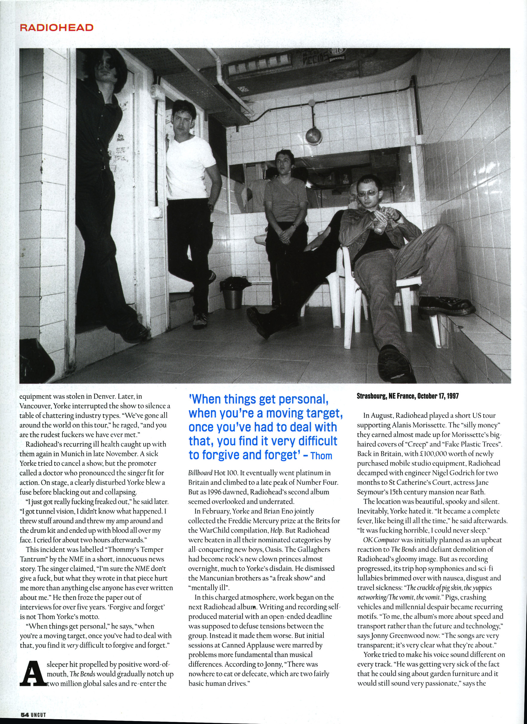 This incident was labelled "Thommy's Temper Tantrum" by the NME in a short, innocuous news story. The singer claimed, "I'm Sure the NME don't give a fuck, but what they wrote in that piece hurt me more than anything else anyone has ever written about me." He then froze the paper out of interviews for over five years. 'Forgive and forget' is not Thom Yorke's motto.