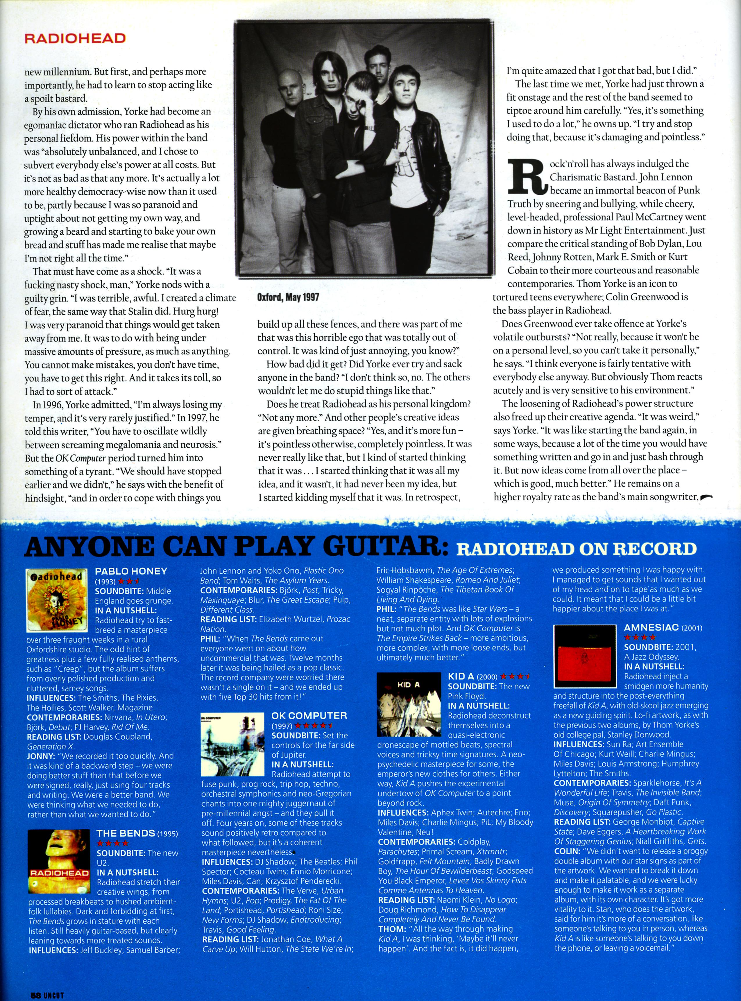 At a riverside London cafe in spring 2001, affable bass-playing Christopher Walken lookalike Colin Greenwood greets Uncut with sardonic quips about the Tory cabinet, G K Chesterton and "the officer's mess". His Jackie O-haired guitar-virtuoso younger brother Jonny likens Radiohead to "18th-century rakes who live life in the country and go to London to gamble the night away". Somewhere in the studio complex behind us, guitarist Ed O'Brien, drummer Phil Selway and Thom Yorke are grudgingly selling their souls to Uncut's photographer.