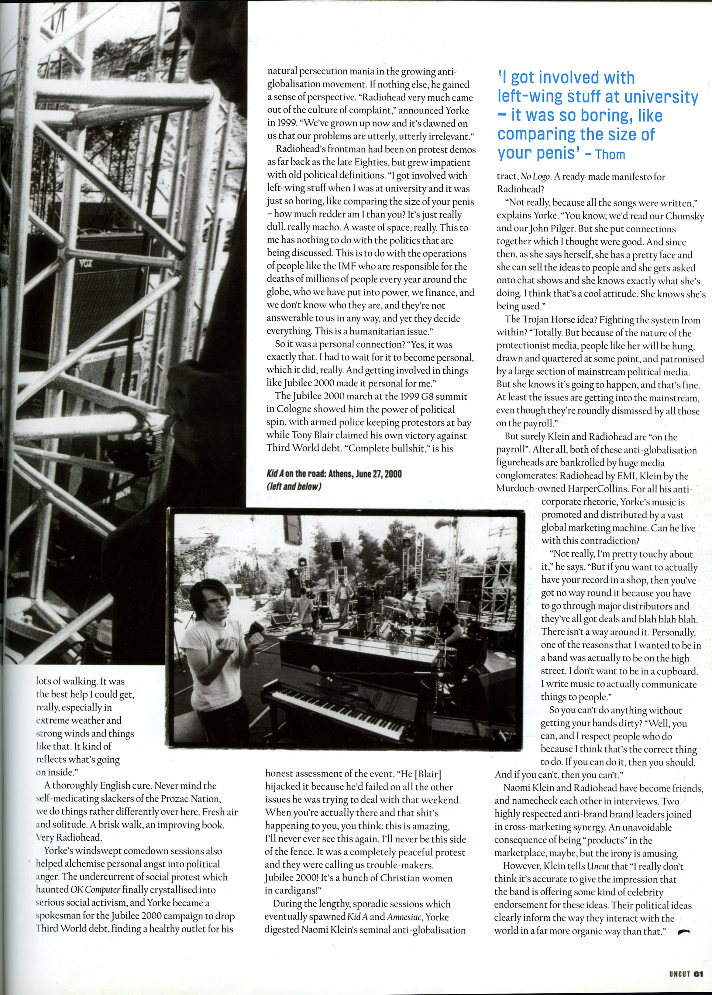 Radiohead's frontman had been on protest demo as far back as the late Eighties, but grew impatient with old political definitions. "I got involved with left-wing stuff when I was at university and it was just so boring, like comparing the size of your penis – how much redder am I than you? It's just really dull, really macho. A waste of space, really. This to me has nothing to do with the politics that are being discussed. This is to do with the operations of people like the IMF who are responsible for the deaths of millions of people every year around the globe, who we have put into power, we finance, and we don't know who they are, and they're not answerable to us in any way, and yet they decide everything. This is a humanitarian issue."