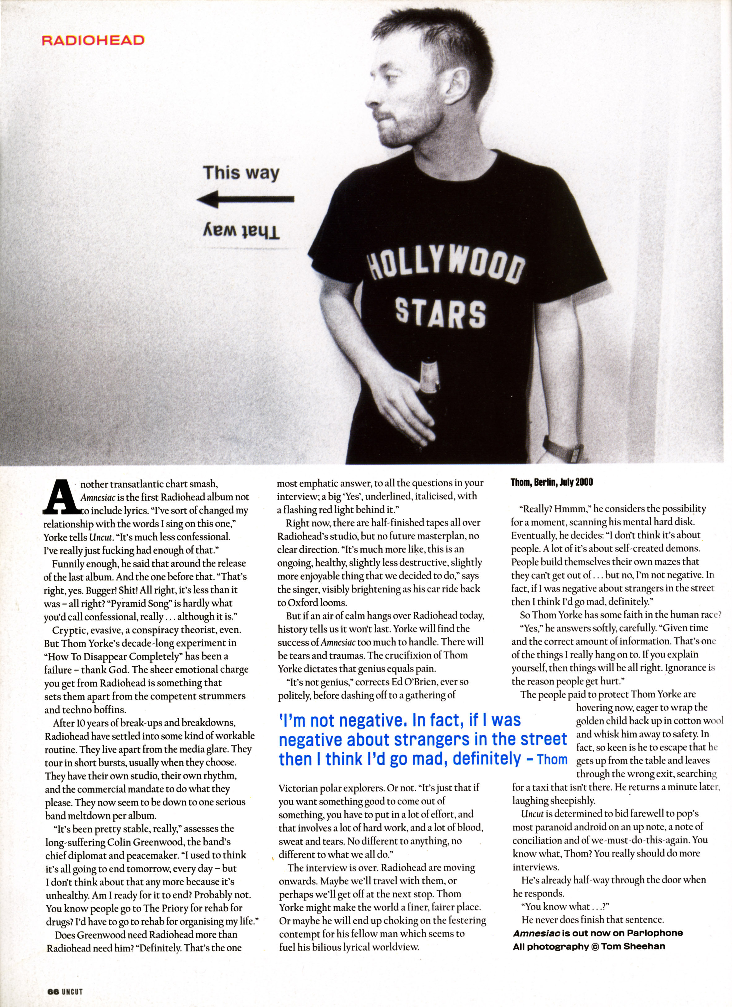 ANOTHER transatlantic chart smash, Amnesiac is the first Radiohead album not to include lyrics. "I've sort of changed my relationship with the words I sing on this one,” Yorke tells Uncut. "It's much less confessional. I've really just fucking had enough of that."