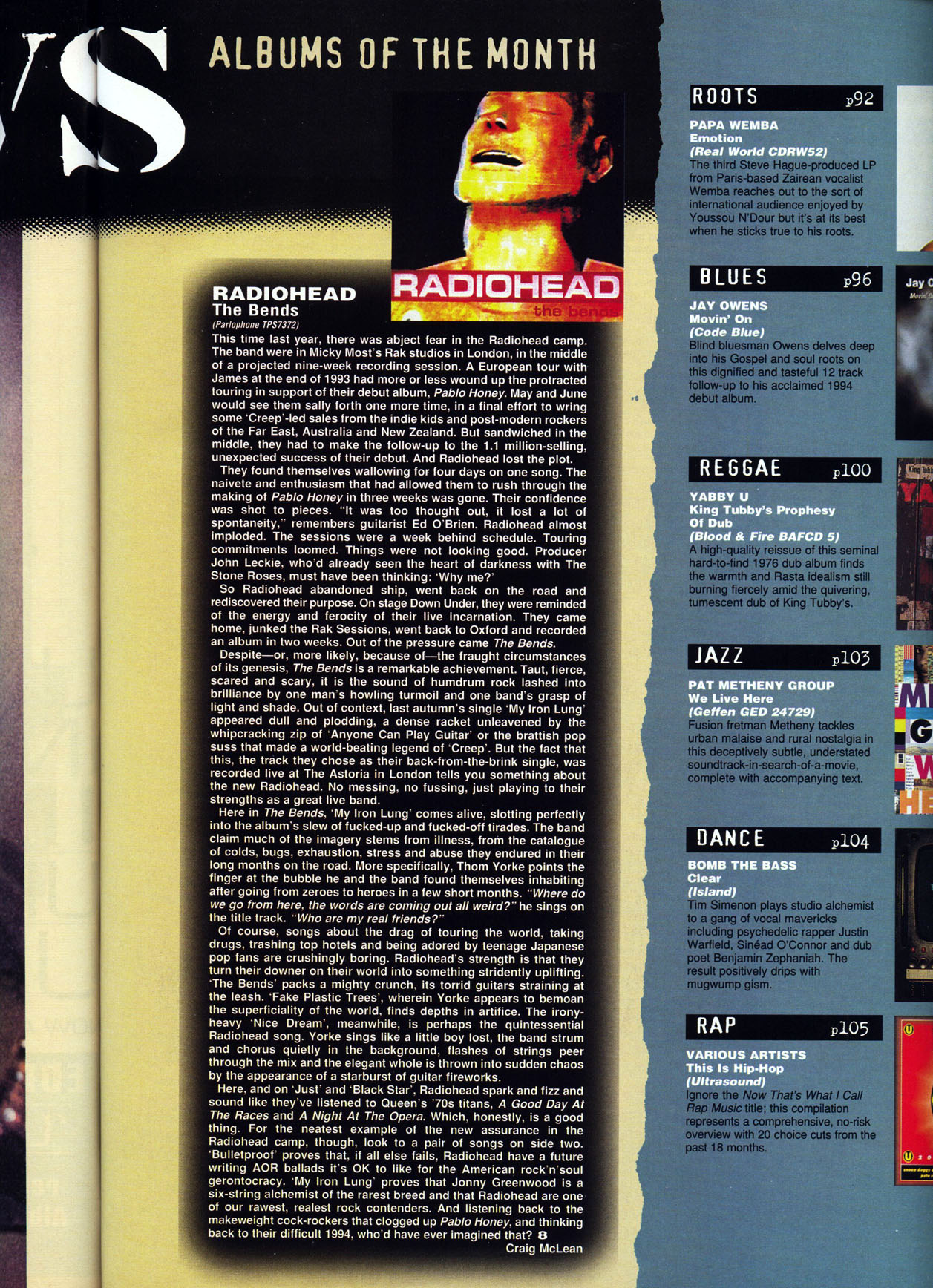 Radiohead's new album, The Bends, probes into dark, introspective territory with greater intensity than their debut, Pablo Honey, which often lost its venom in rock posturing. Musically, The Bends is a taut but powerful album, spewing out Thom's lyrics with a fierce directness that is badly lacking in the arty minimalism of contemporaries like The Auteurs or Brett Anderson's second-hand romanticism. Certainly the stresses created by the massive success of "Creep" in the States have fueled some of the songs.