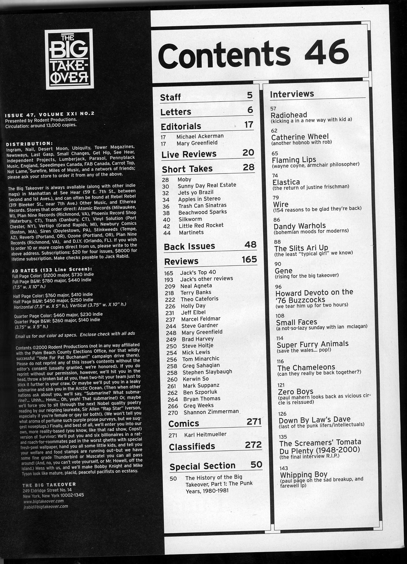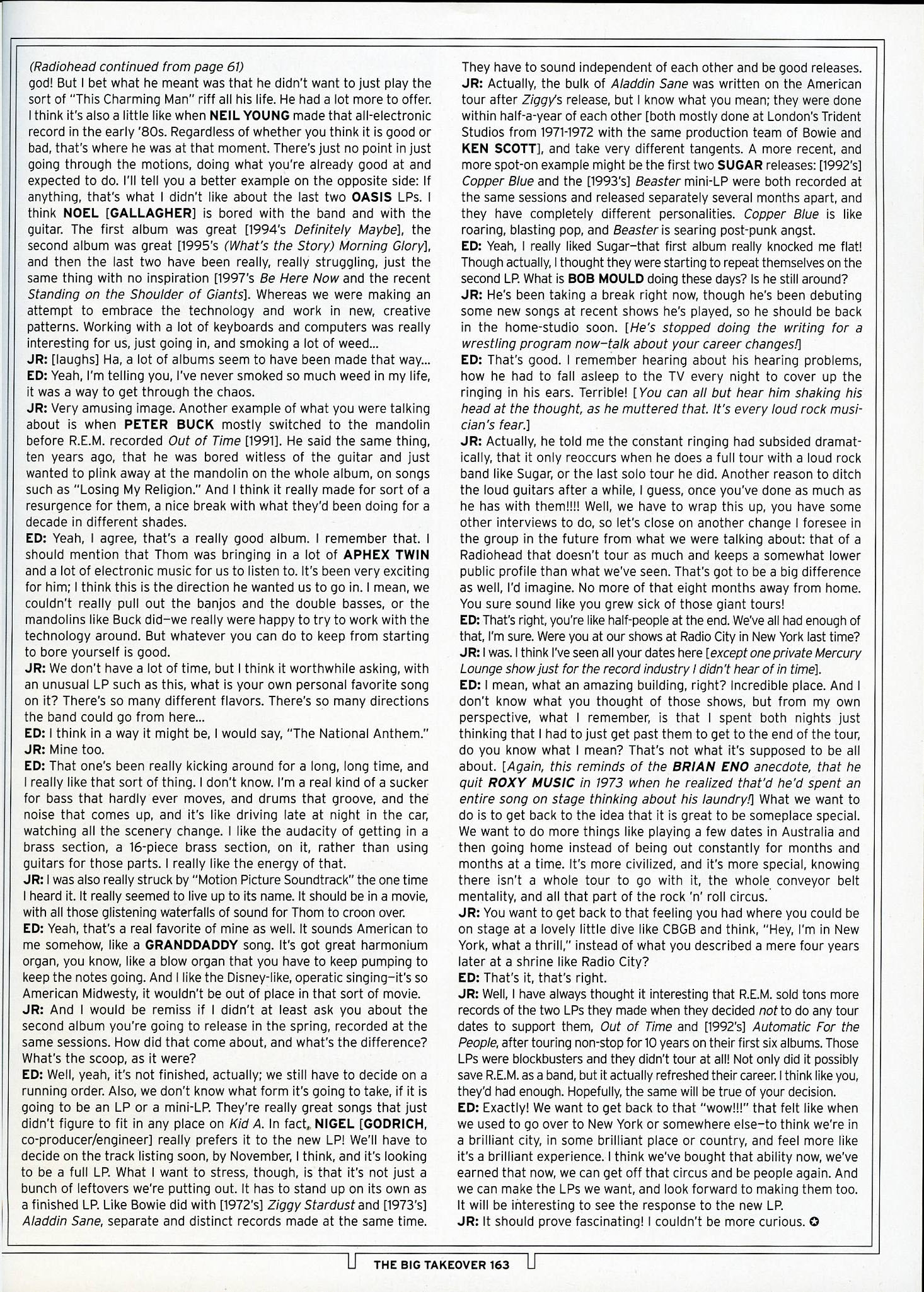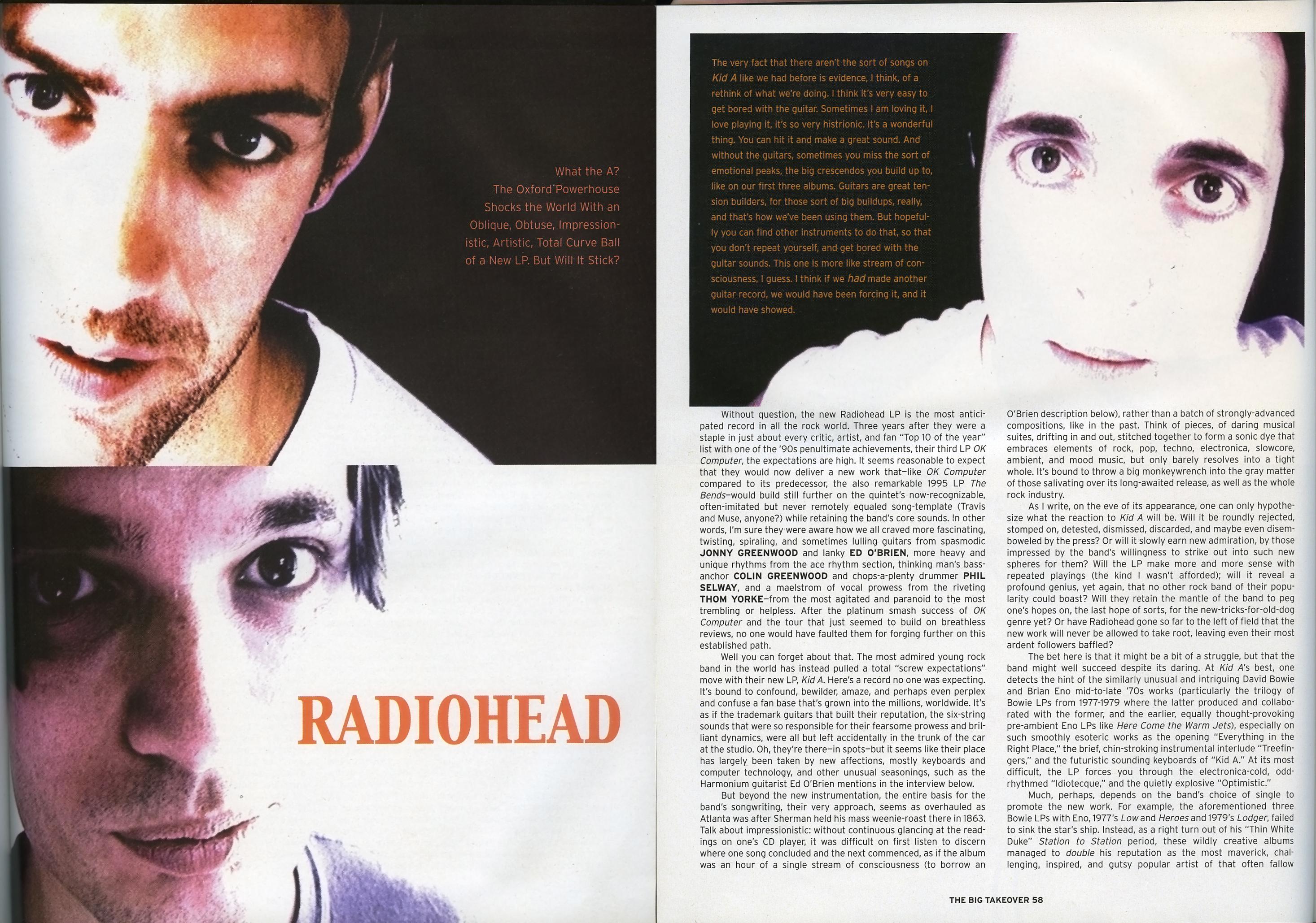 ED: Well, yeah, it’s not finished, actually; we still have to decide on a running order. Also, we don’t know what form it’s going to take, if it is going to be an LP or a mini-LP. They’re really great songs that just didn’t figure to fit in any place on Kid A. In fact, Nigel [Godrich, co-producer/engineer] really prefers it to the new LP! We’ll have to decide on the track listing soon, by November, I think, and it’s looking to be a full LP. What I want to stress, though, is that it’s not just a bunch of leftovers we’re putting out. It has to stand up on its own as a finished LP. Like Bowie did with [1972's] Ziggy Stardust and [1973's] Aladdin Sane, separate and distinct records made at the same time. They have to sound independent of each other and be good releases.