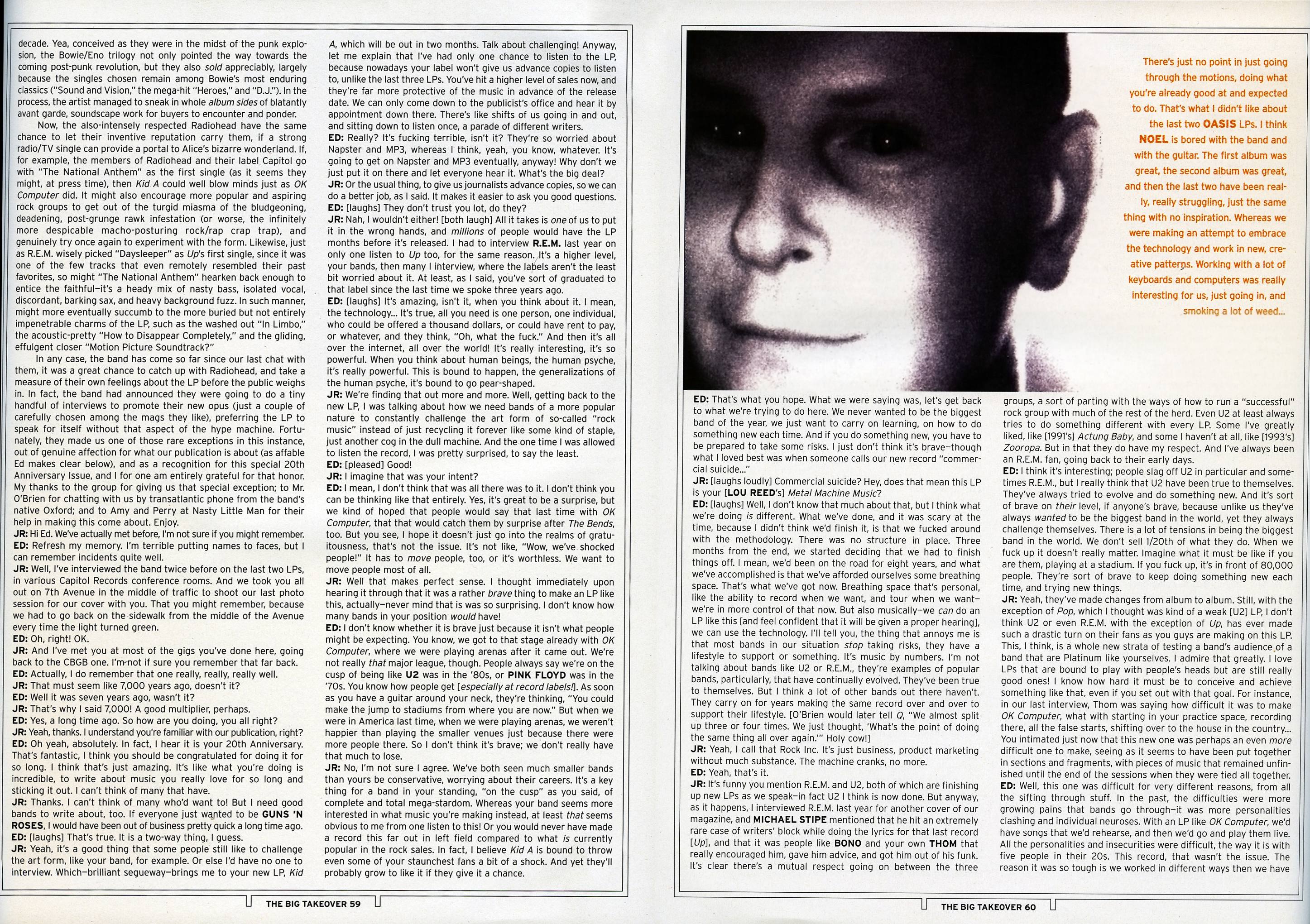 JR: Yeah, they’ve made changes from album to album. Still, with the exception of Pop, which I thought was kind of a weak [U2] LP, I don’t think U2 or even R.E.M. with the exception of Up has ever made such a drastic turn on their fans as you guys are making on this LP. This, I think, is a whole new strata of testing a band’s audience of a band that are Platinum like yourselves. I admire that greatly. I love LPS that are bound to play with people’s heads but are still really good ones! I know how hard it must be to conceive and achieve something like that, even if you set out with that goal. For instance, in our last interview, Thom was saying how difficult it was to make OK Computer, what with starting in your practice space, recording there, all the false starts, shifting over to the house in the country... You intimated just now that this new one was perhaps an even more difficult one to make, seeing as it seems to have been put together in sections and fragments, with pieces of music that remained unfinished until the end of the sessions when they were tied all together.