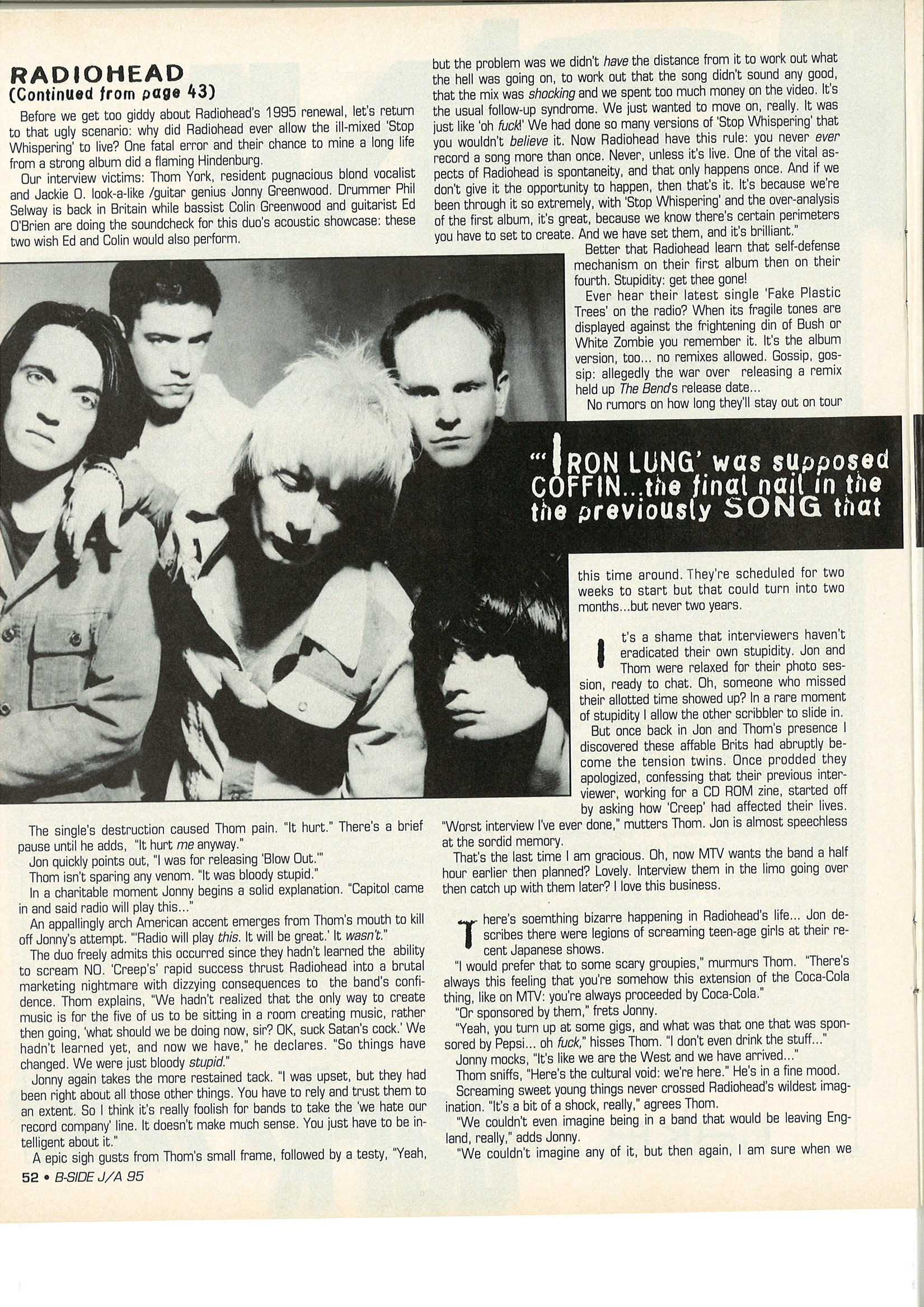 The duo freely admits this occurred since they hadn't learned the ability to scream NO. 'Creep's' rapid success thrust Radiohead into a brutal marketing nightmare with dizzying consequences to the band's confidence. Thom explains, "We hadn't realized that the only way to create music is for the five of us to be sitting in a room creating music, rather then going, 'what should we be doing now, sir? OK, suck Satan's cock.' We hadn't learned yet, and now we have", he declares. "So things have changed. We were just bloody stupid."