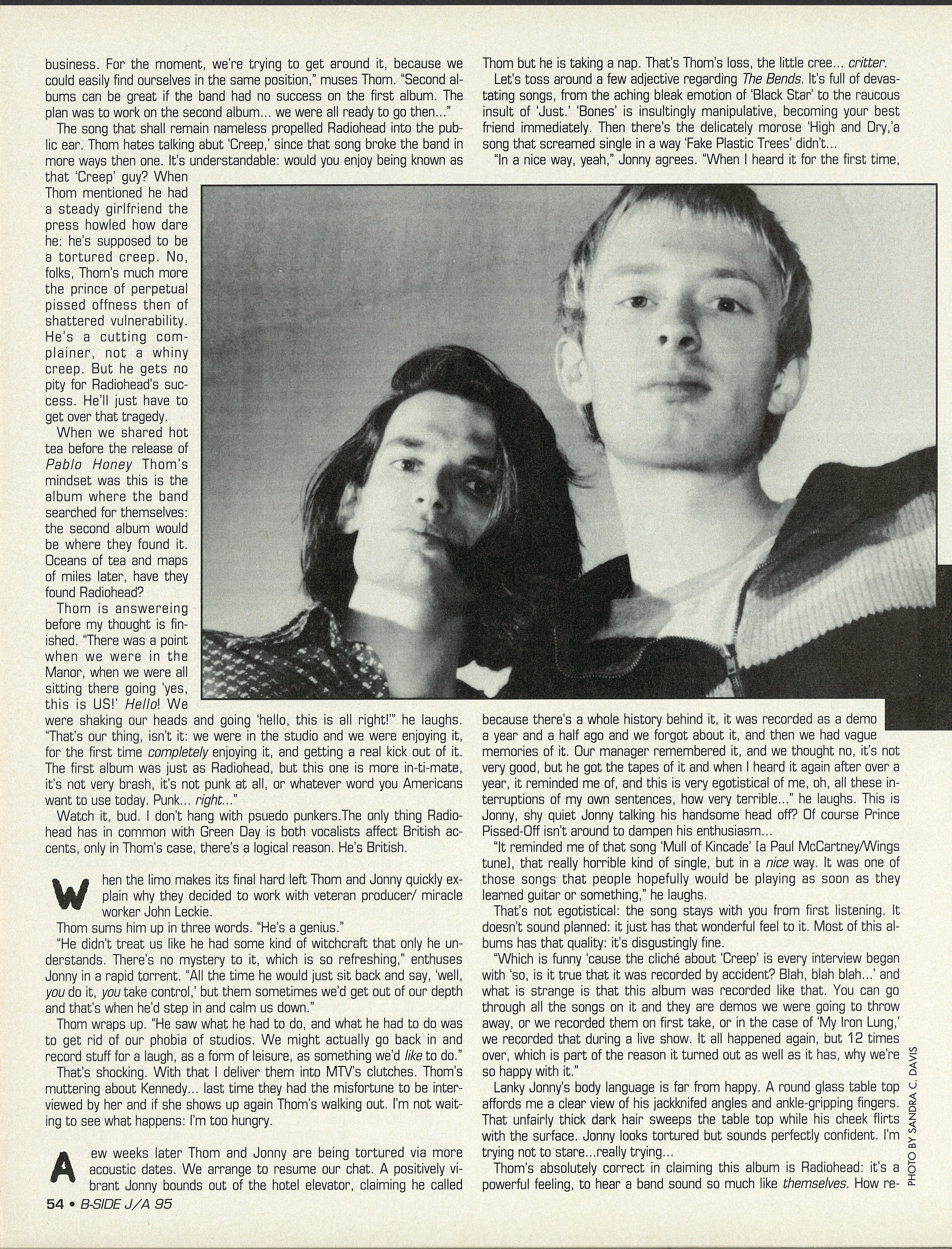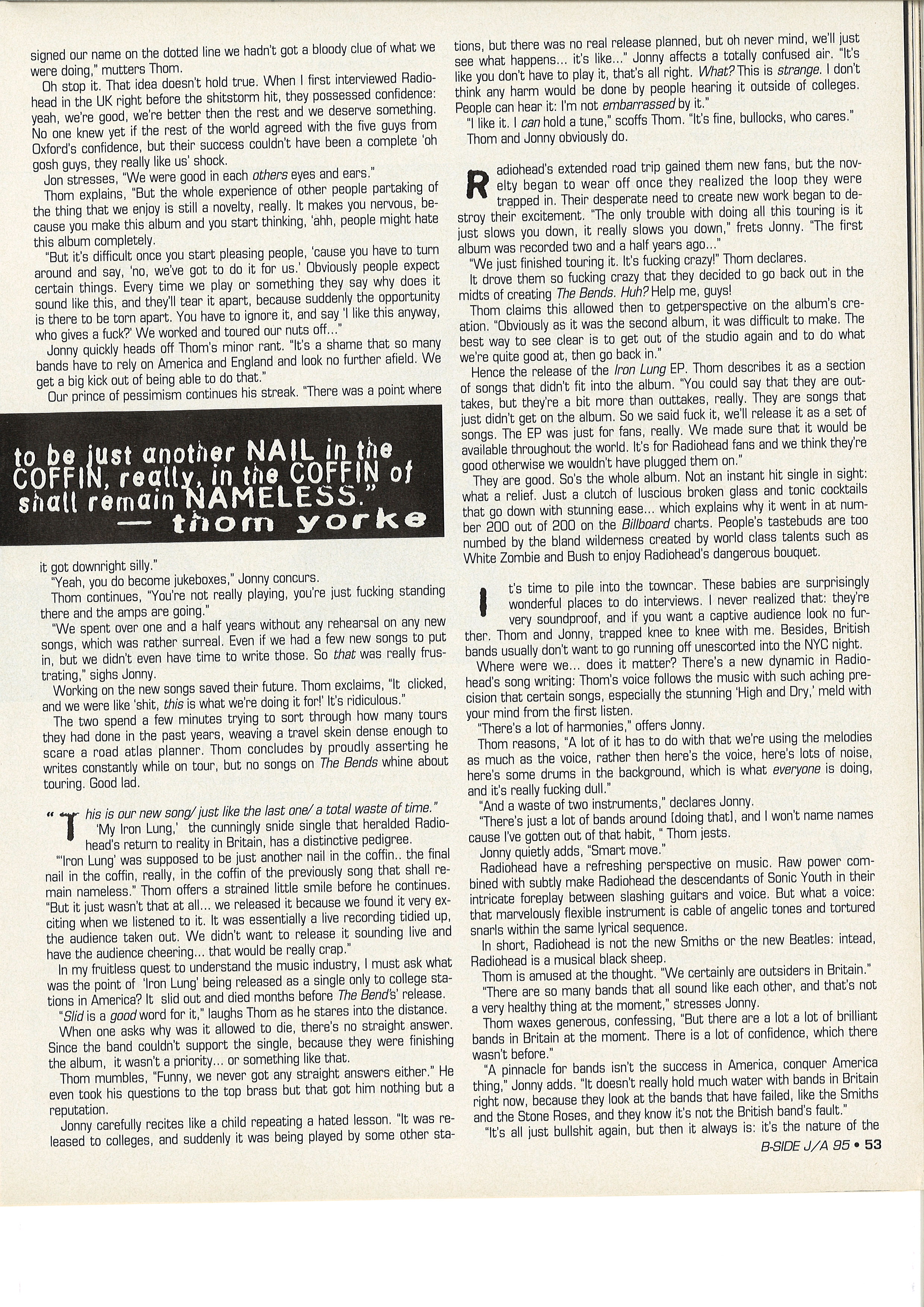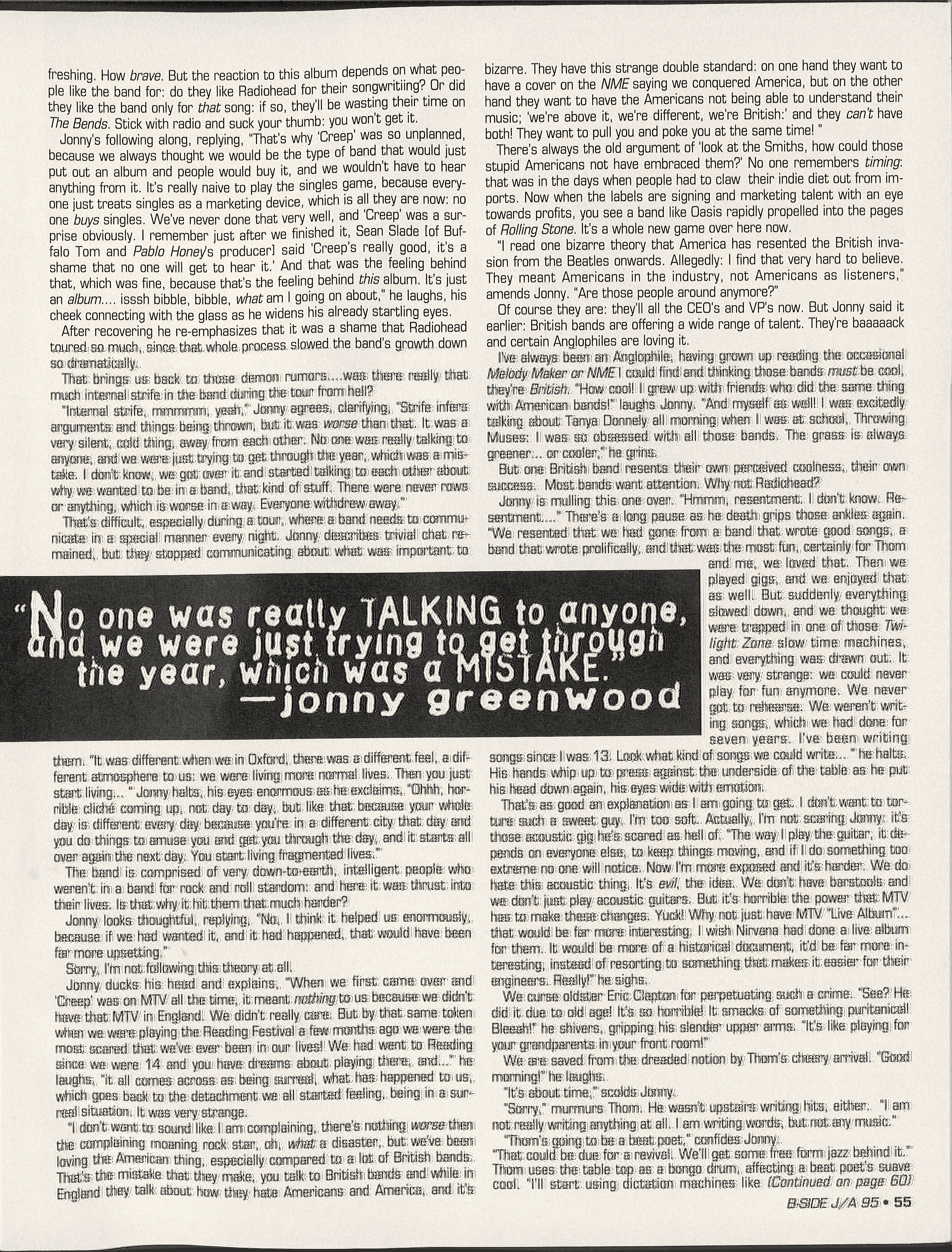 The look that I receive should be framed. After some general complaints on the band's "bloody embarrassing" advertising campaign for Pablo Honey, Thom admits, "With this album, even if absolutely everything goes wrong, we can actually see beyond it now. We never really could before, because we were never in a position of strength before. So now there's a lot of people who have been waiting, who came to see us live, and knew what we could do. Suddenly whatever that was is translated into a record, and that's not just a live bombastic sound. It's not at all like that. But we're actually quite good, actually," he smiles. "The first album was good, but it didn't show the extent of what we could do, that's all. Because we couldn't do it yet."