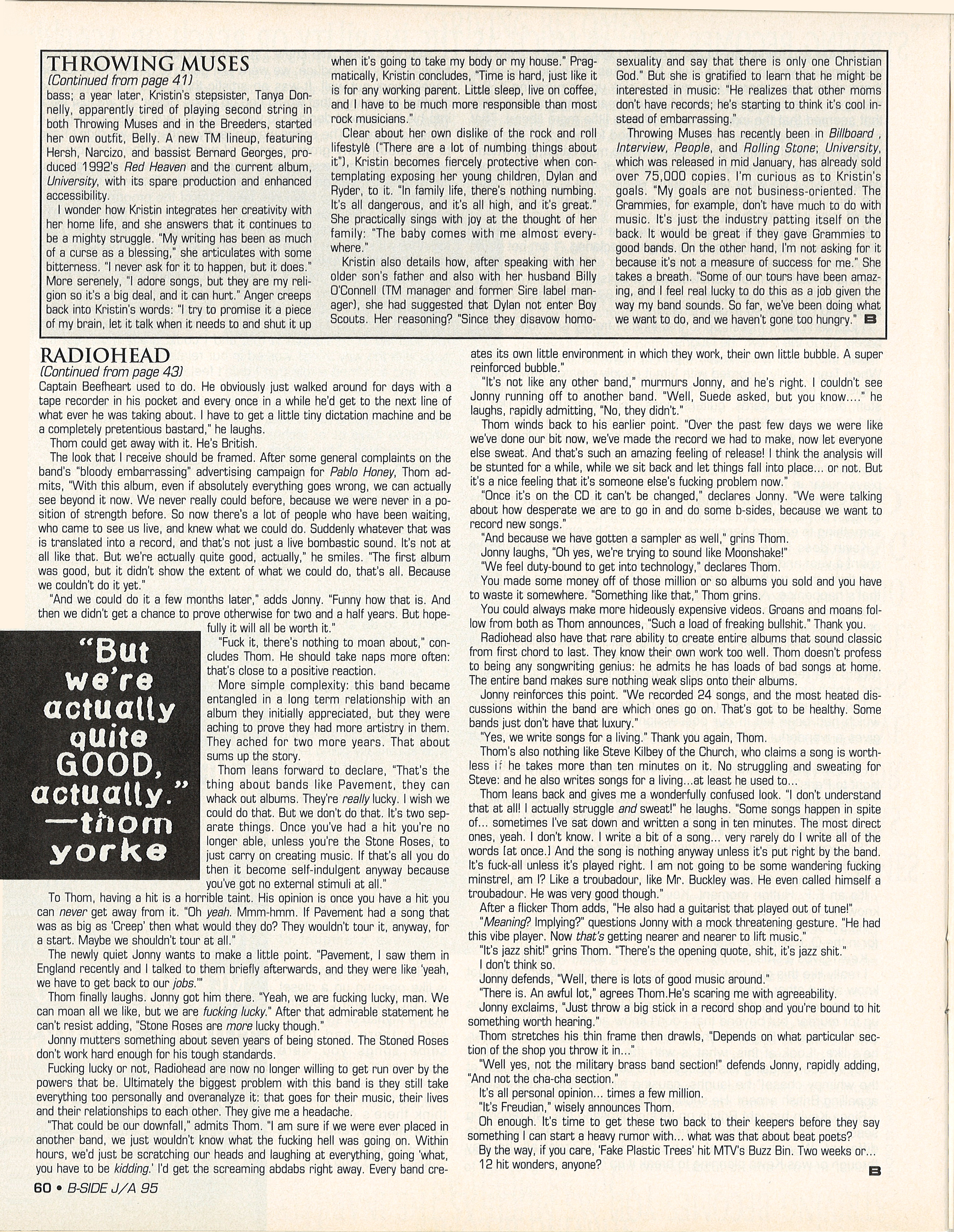 The two spend a few minutes trying to sort through how many tours they had done in the past years, weaving a travel skein dense enough to scare a road atlas planner. Thom concludes by proudly asserting he writes constantly while on tour, but no songs on The Bends whine about touring. Good lad.