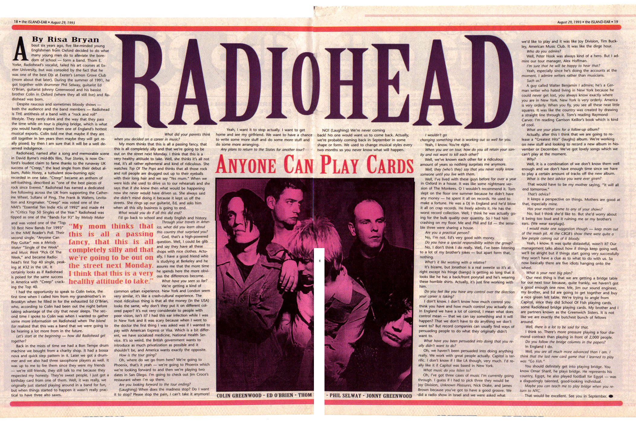 I had the opportunity to speak to Colin twice, the first time when I called him from my grandmother’s in Brooklyn when he filled in for the exhausted Ed O’Brian, who, according to Colin had been out the night before taking advantage of the city that never sleeps. The second time I spoke t Colin was when I wanted to gather some more information on Radiohead when The Island Ear realized that this was a band that we were going to be hearing a lot more from in the future.
