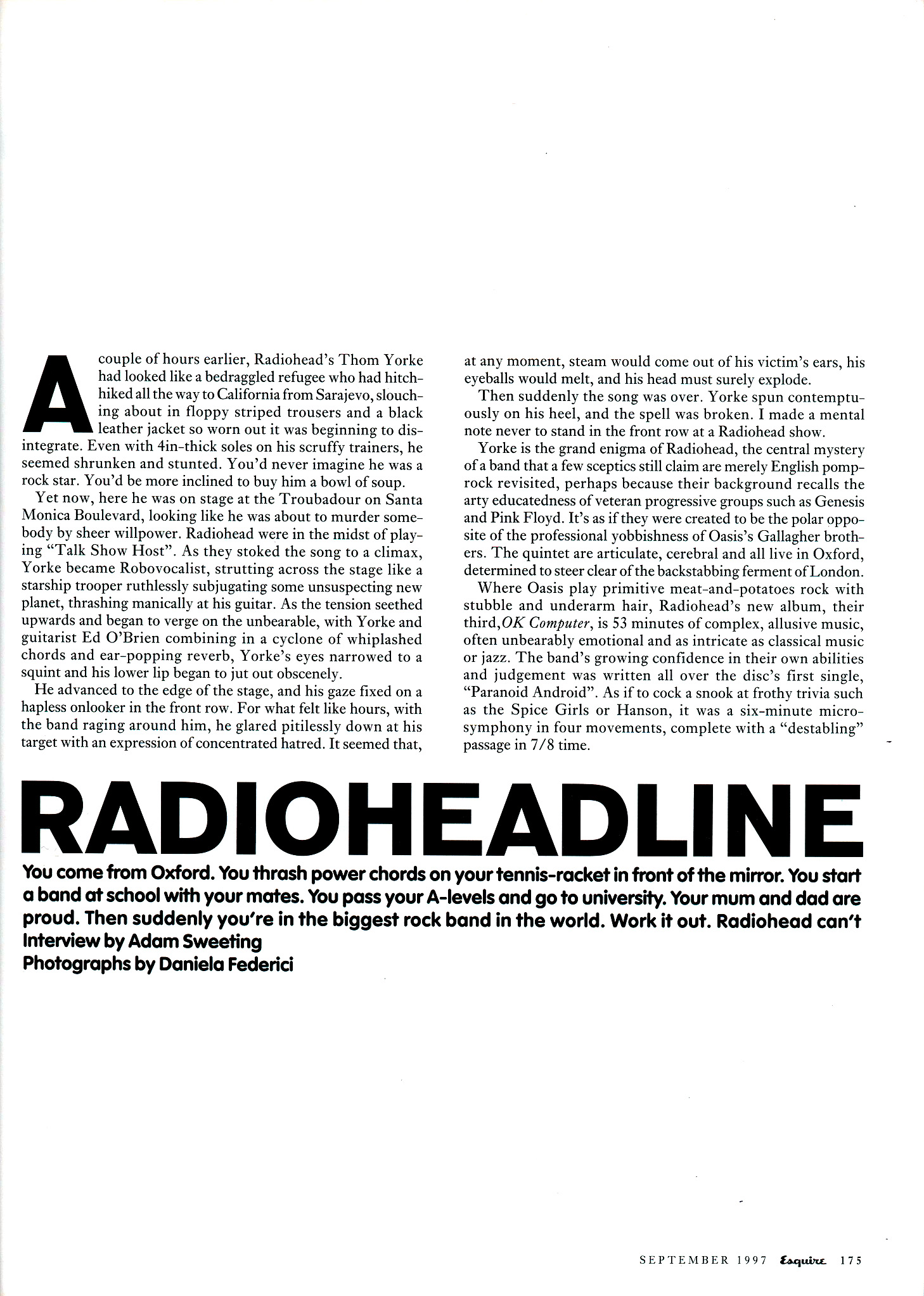 Where Oasis play primitive meat-and-potatoes rock with stubble and underarm hair, Radiohead’s new album, their third, OK Computer, is 53 minutes of complex, allusive music, often unbearably emotional and as intricate as classical music or jazz. The band’s growing confidence in their own abilities and judgement was written all over the disc’s first single, “Paranoid Android”. As if to cock a snook at frothy trivia such as the Spice Girls or Hanson, it was a six-minute micro-symphony in four movements, complete with a “destabling” passage in 7/8 time.