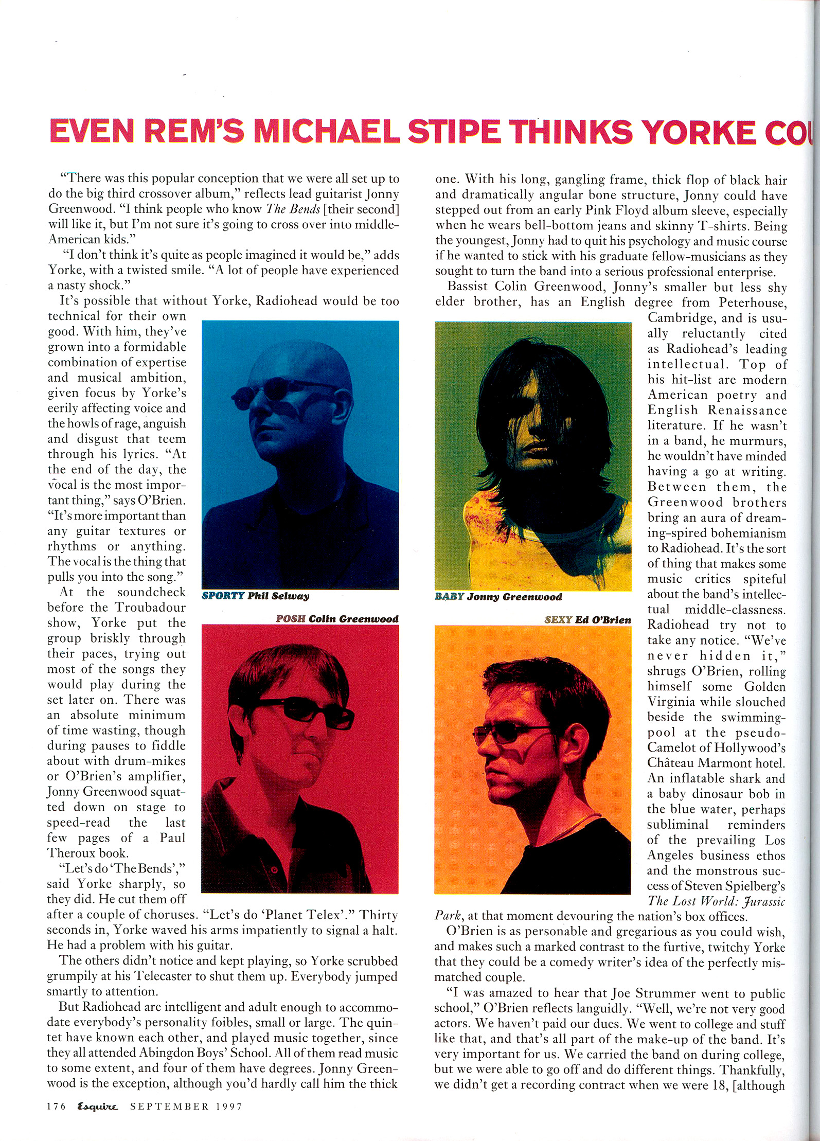 Calm is restored by drummer Phil Selway, the oldest member at 30. He briefly held down a “real” job as a desk editor with a medical publishing firm in Oxford. O’Brien remembers how the others recruited Selway when they were still at school and he’d already left, lending the sticksman aura of experienced adulthood. A summit meeting was arranged in a local pub, and they all pussyfooted gingerly round the subject of his recruitment so nobody should lose face.