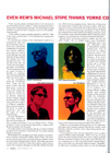 “I think it’s got to the stage of fuck it, you can’t be responsible for people being screwed up and unstable,” reckons O’Brien. “When you have people writing in from Death Row, it’s quite a heavy burden on young shoulders, to put it mildly. Patti Smith said something about a song capturing a time and that’s it, you can’t be responsible six months later if people take it differently. I think people have seen over the last year that Thom is not the tortured artist, and he’s really enjoying being able to look outside himself.”