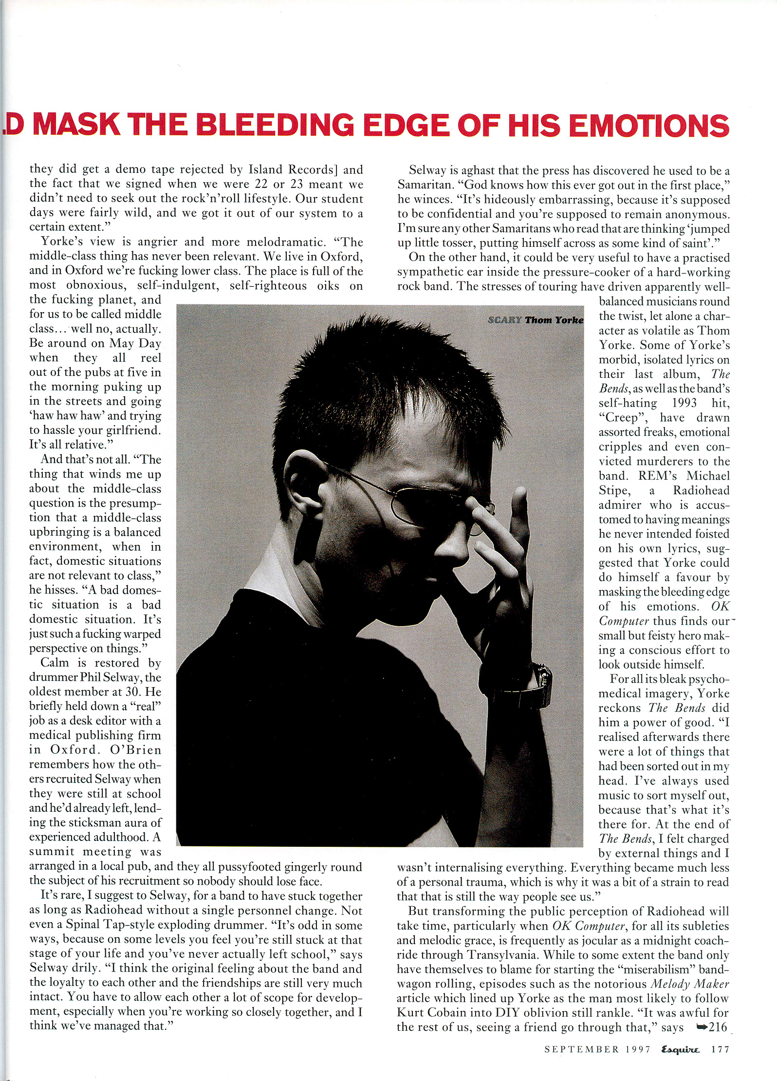 Yorke’s view is angrier and more melodramatic. “The middle-class thing has never been relevant. We live in Oxford, and in Oxford we’re fucking lower class. The place is full of the most obnoxious, self-indulgent, self-righteous oiks on the fucking planet, and for us to be called middle class... well no, actually. Be around on May Day when they all reel out of the pubs at five in the morning puking up in the streets and going ‘haw haw haw’ and trying to hassle your girlfriend. It’s all relative.”