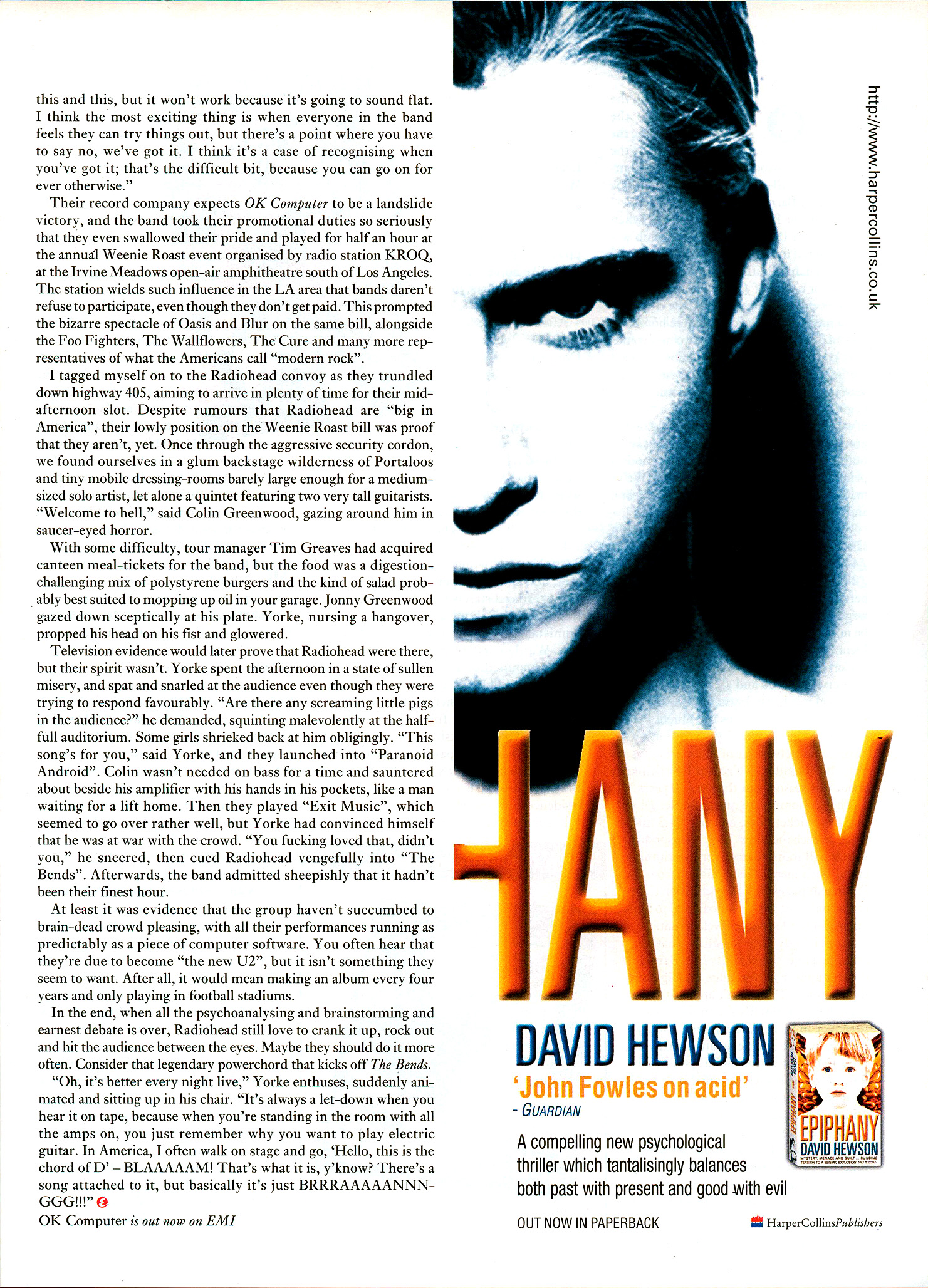 Their record company expects OK Computer to be a landslide victory, and the band took their promotional duties so seriously that they even swallowed their pride and played for half an hour at the annual Weenie Roast event organised by radio station KROQ, at the Irvine Meadows open-air amphitheatre south of Los Angeles. The station wields such influence in the LA area that bands daren’t refuse to participate, even though they don’t get paid. This prompted the bizarre spectacle of Oasis and Blur on the same bill, alongside the Foo Fighters, The Wallflowers, The Cure and many more representatives of what the Americans call “modern rock”.