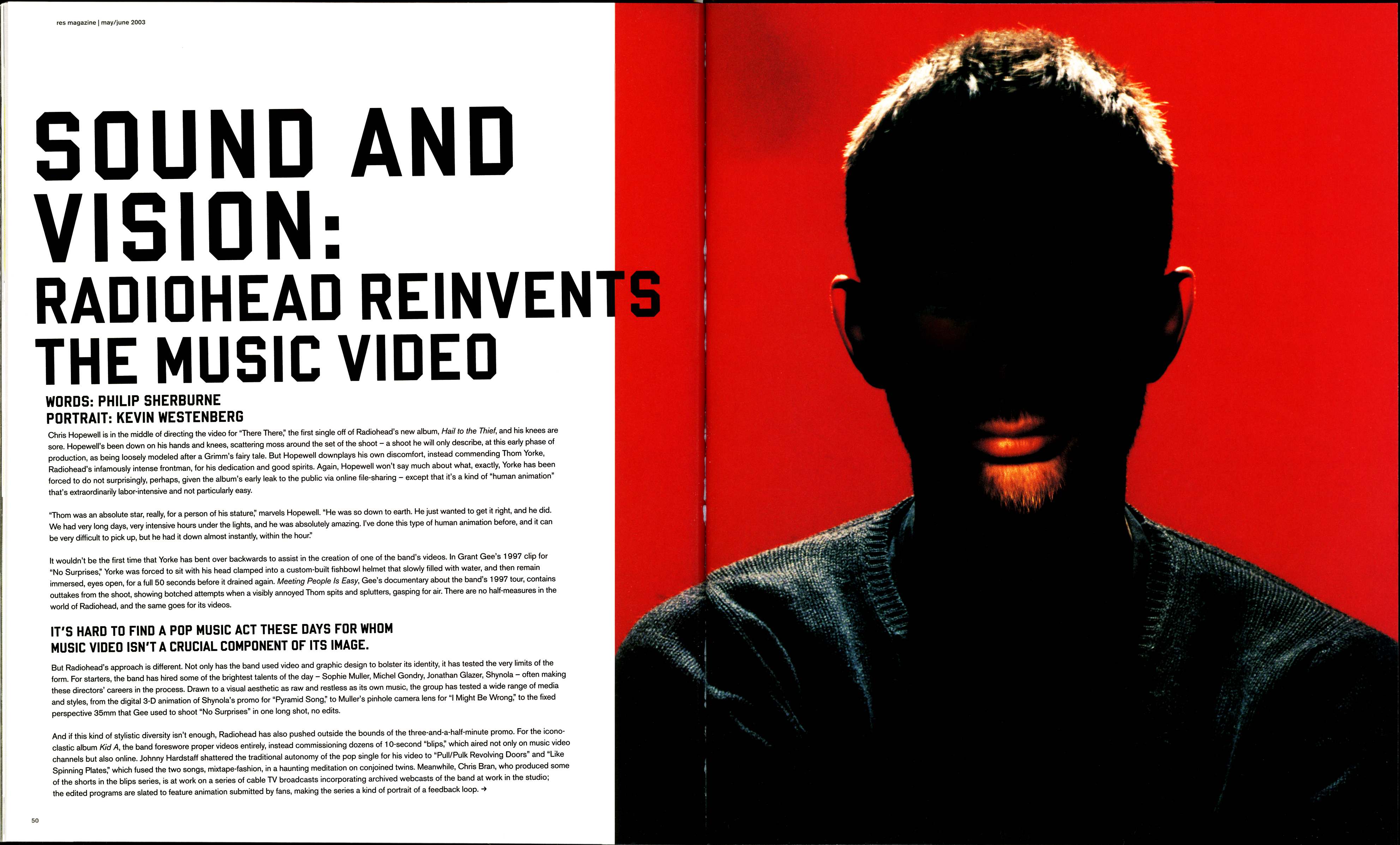 Chris Hopewell is in the middle of directing the video for “There There,” the first single off of Radiohead’s new album, Hail to the Thief, and his knees are sore. Hopewell’s been down on his hands and knees, scattering moss around the set of the shoot – a shoot he will only describe, at this early phase of production, as being loosely modeled after a Grimm’s fairy tale. But Hopewell downplays his own discomfort, instead commending Thom Yorke, Radiohead’s infamously intense frontman, for his dedication and good spirits. Again, Hopewell won’t say much about what, exactly, Yorke has been forced to do not surprisingly, perhaps, given the album’s early leak to the public via online file-sharing – except that it’s a kind of human animation that’s extraordinarily labor-intensive and not particularly easy.