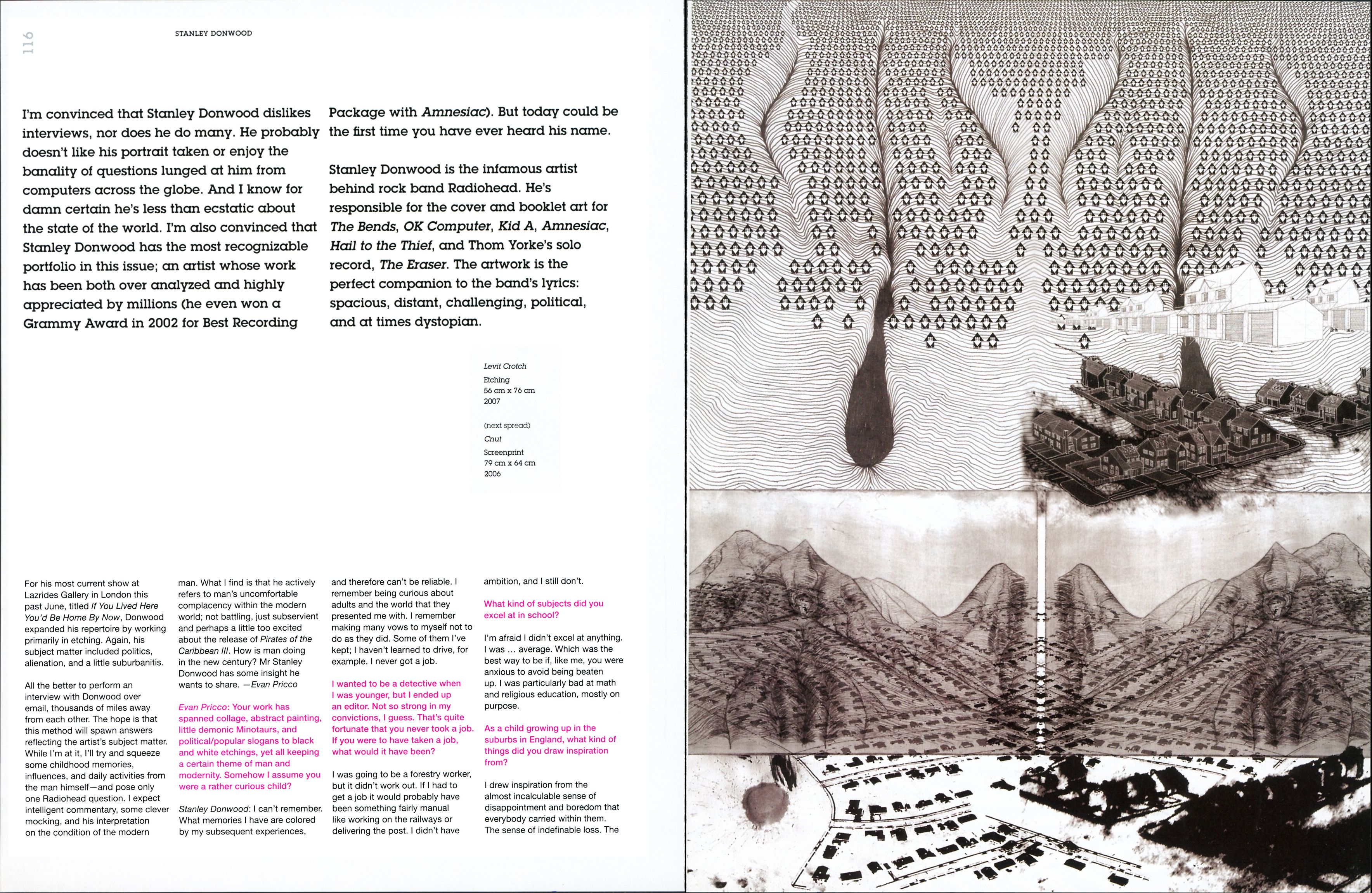 I’m convinced that Stanley Donwood dislikes interviews, nor does he do many. He probably doesn’t like his portrait taken or enjoy the banality of questions lunged at him from computers across the globe. And I know for damn certain he’s less than ecstatic about the state of the world. I’m also convinced that Stanley Donwood has the most recognizable portfolio in this issue; an artist whose work has been both over analyzed and highly appreciated by millions (he even won a Grammy Award in 2002 for Best Recording Package with Amnesiac). But today could be the first time you have ever heard his name.