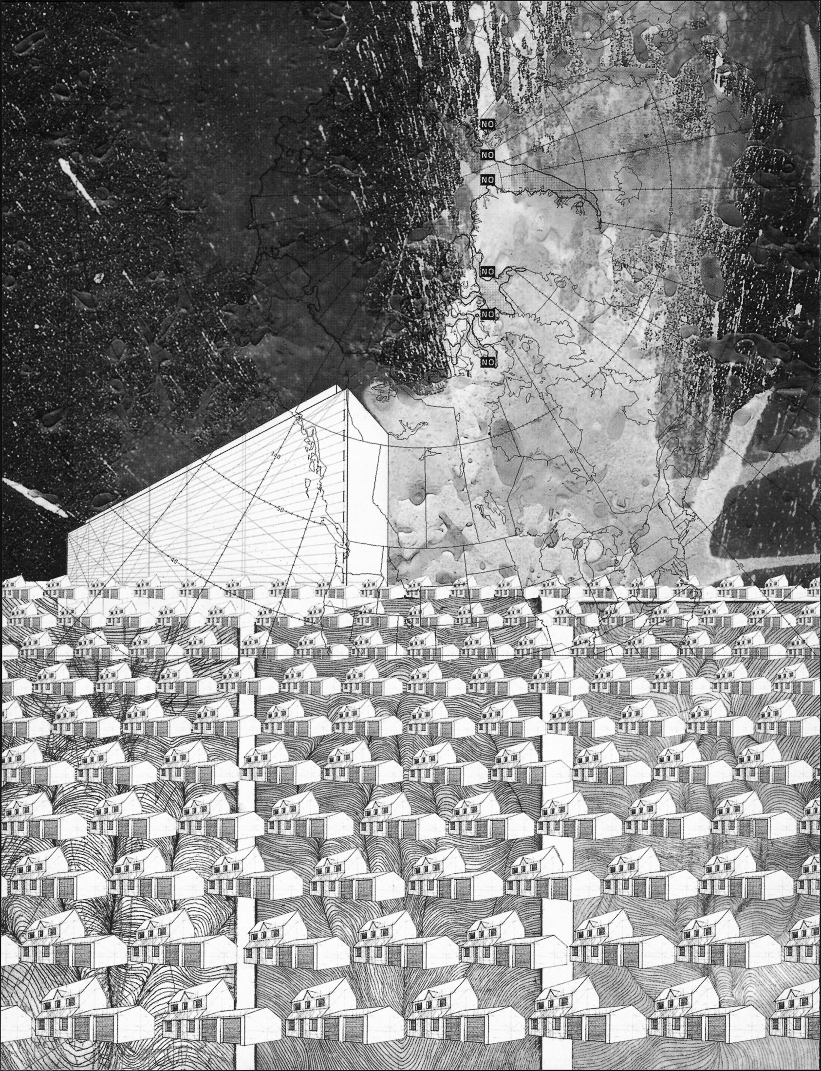For his most current show at Lazrides [sic] Gallery in London this past June, titled If You Lived Here You’d Be Home By Now, Donwood expanded his repertoire by working primarily in etching. Again, his subject matter included politics, alienation, and a little suburbanitis.