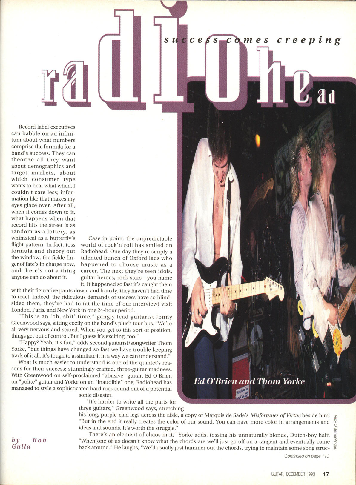 Whether it's the distorted chicka-chicka that unplugs the emotional and musical dike on "Creep" or the opening fuzz on the cynical "Anyone Can Play Guitar,” or the gentle arpeggios and melodic hooks that decorate the entire album, Radiohead has come on as a volatile and stylish guitar band.
