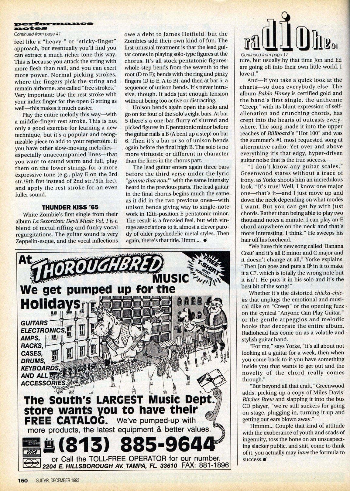 “I don't know any guitar scales," Greenwood states without a trace of irony as Yorke shoots him an incredulous look. "It's true! Well, I know one major one - that's it - and l just move up and down the neck depending on what modes I want. But you can get by with just chords. Rather than being able to play two thousand notes a minute, I can play an E chord anywhere on the neck and that's more interesting, I think." He sweeps his hair off his forehead.