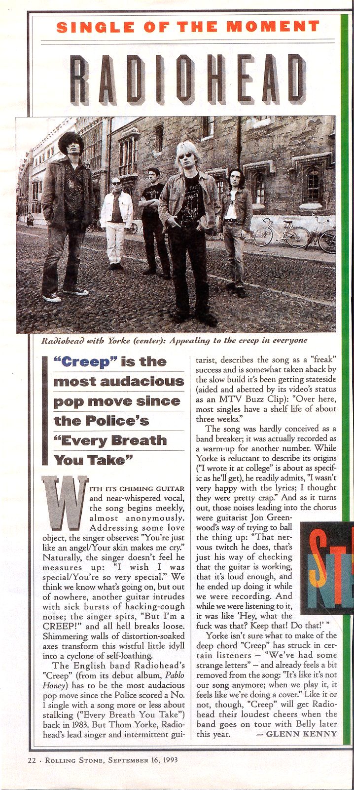 Yorke isn't sure what to make of the deep chord "Creep" has struck in certain listeners -- "We've had some strange letters" -- and already feels a bit removed from the song: "It's like it's not our song anymore; when we play it, it feels like we're doing a cover." Like it or not, though, "Creep" will get Radiohead their loudest cheers when the band goes on tour with Belly later this year.
