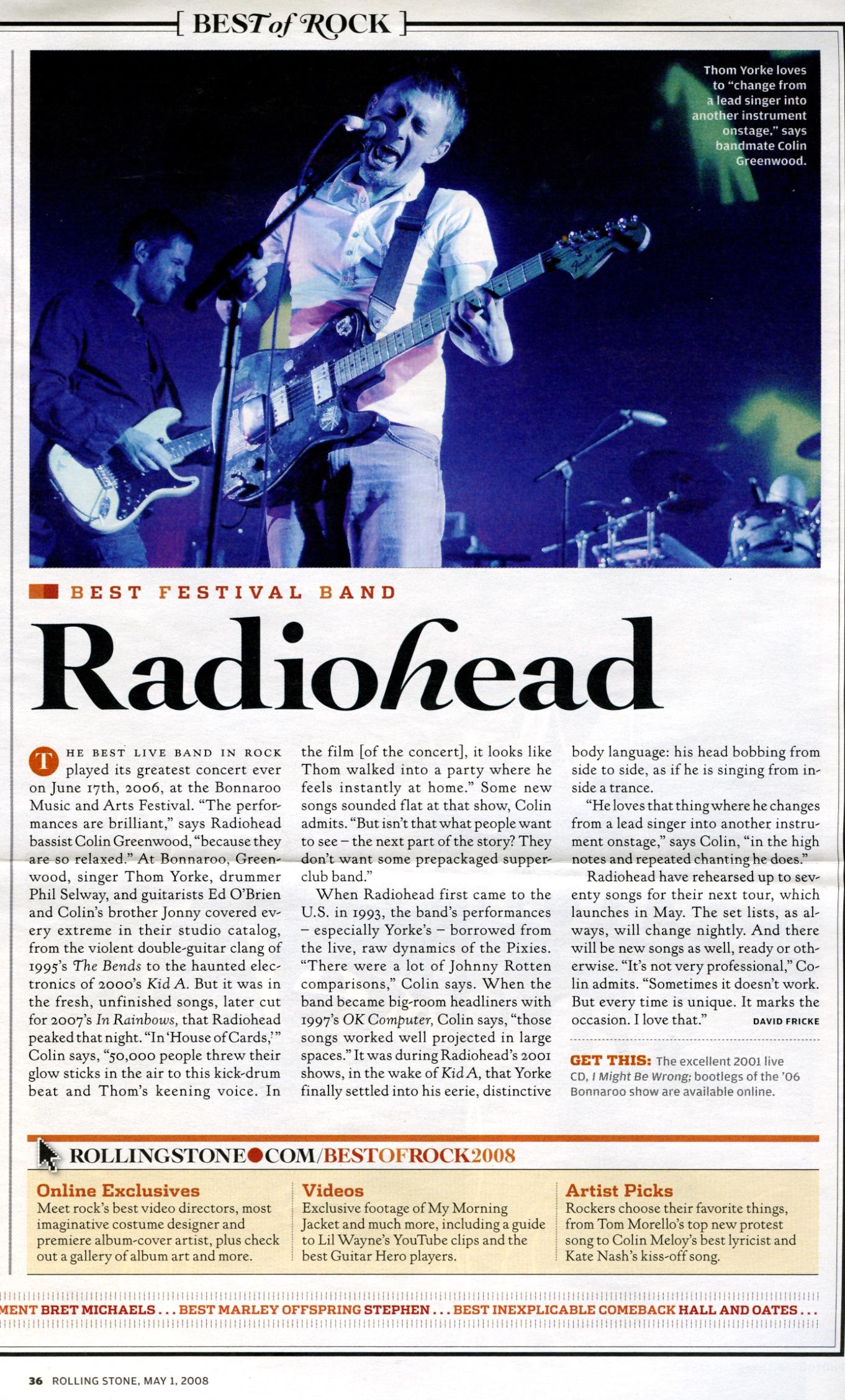 The best live band in rock played its greatest concert ever on June 17th, 2006, at the Bonnaroo Music and Arts Festival. "The performances are brilliant," says Radiohead bassist Colin Greenwood, "because they are so relaxed." At Bonnaroo, Greenwood, singer Thom Yorke, drummer Phil Selway, and guitarists Ed O'Brien and Colin's brother Jonny covered every extreme in their studio catalog, from the violent double-guitar clang of 1995's The Bends to the haunted electronics of 2000's Kid A. But it was in the fresh, unfinished songs, later cut for 2007's In Rainbows, that Radiohead peaked that night. "In 'House of Cards,'" Colin says, "50,000 people threw their glow sticks in the air to this kick-drum beat and Thom's keening voice. In the film [of the concert], it looks like Thom walked into a party where he feels instantly at home." Some new songs sounded flat at that show, Colin admits. "But isn't that what people want to see — the next part of the story? They don't want some prepackaged supper-club band."