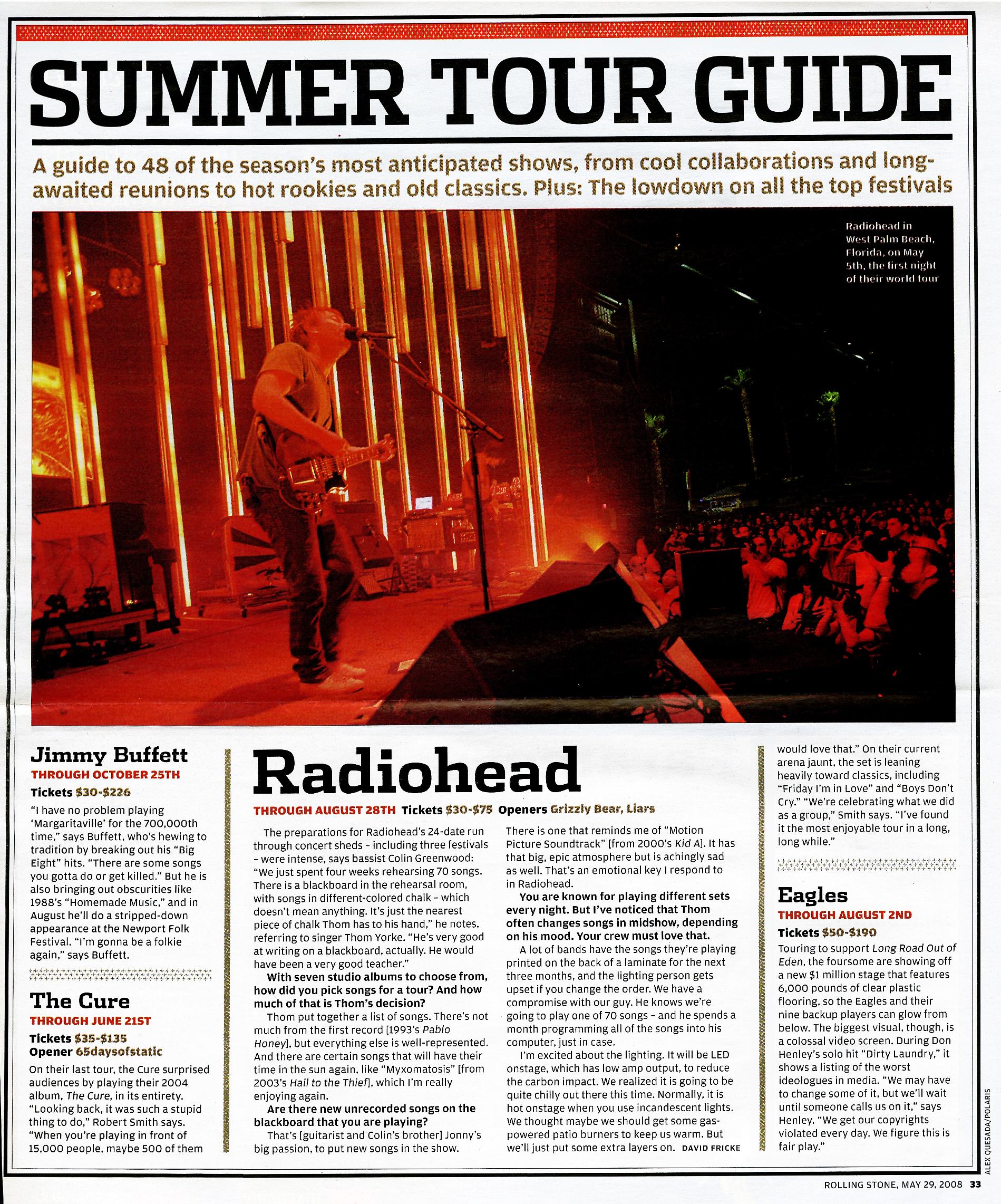 The preparations for Radiohead's 24-date run through concert sheds — including three festivals — were intense, says bassist Colin Greenwood: "We just spent four weeks rehearsing 70 songs. There is a blackboard in the rehearsal room, with songs in different-colored chalk — which doesn't mean anything. It's just the nearest piece of chalk Thom has to his hand," he notes, referring to singer Thom Yorke. "He's very good at writing on a blackboard, actually. He would have been a very good teacher."