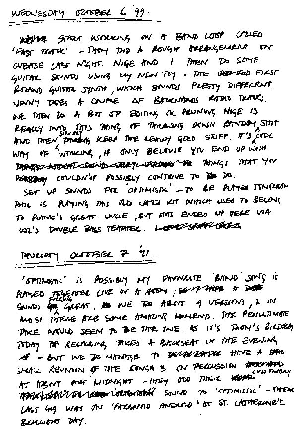there's a line drawn.....above which are the names of tracks finished bar mixing.....and below, those nearly completed. for the first time the tracks below and above the line are equal in number. that was the state of play at 5am friday morning. 'knives up' was complete. i was telling a mate over the w/end about 'knives out' and how it was started in copenhagen on 10/3/99.......some 373 days later we finally finished it.............a ridiculously long gestation period for any song..........naturally my mate thought that having taken so long on a piece of music it would be some sort of magnum opus, a kind of paranoid android to the power of ten..................... the song is probably the most straight ahead thing that we've done in years......and that might explain why we took so long on it. i'm a real believer that bands as they become more successful often lose the ability to do straight ahead stuff well...... the need to embellish tracks with melodies and sounds becomes imperative. and often in doing so the song loses its essence especially if it was written on acoustic guitar. but i think we've done alright on 'knives out'.........