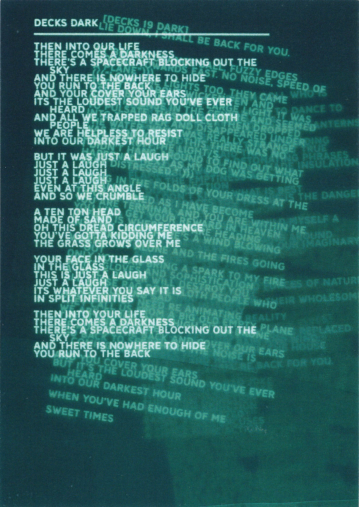 The lyrics for the song can be seen in one of eleven pieces of artwork made from several layers of tracing paper, including some early drafts beneath the final one: