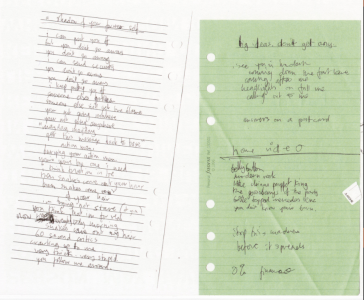 Within a book included in a deluxe box set of the OKNOTOK reissue, there is a page containing draft lyrics for "Follow Me Around" (click image for full size):
